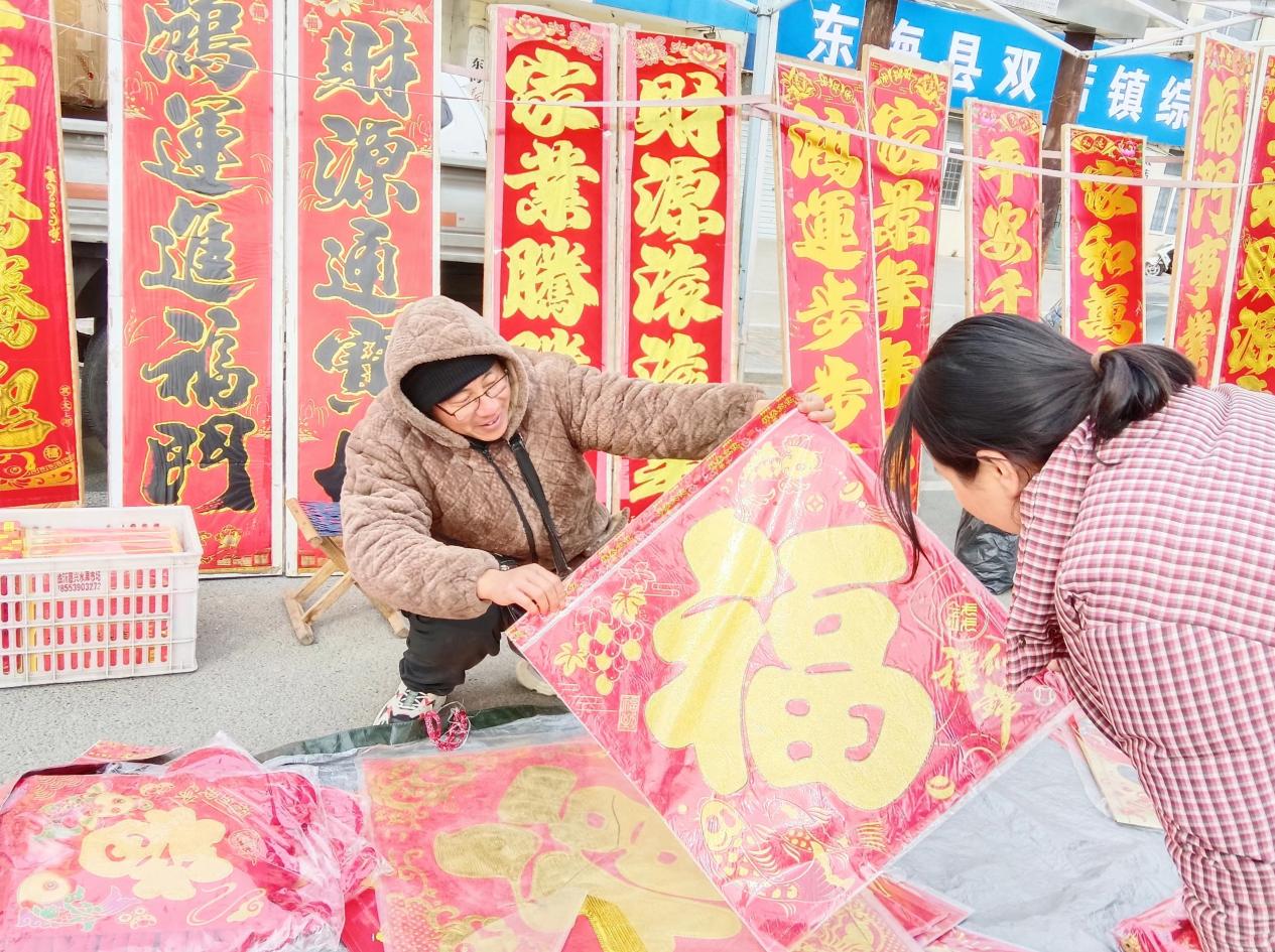 中国江苏网2月7日连云港讯 无联不成春,有联春更浓。随着新春佳节的临近,东海县双店镇农村大集上春联、福字、中国结、灯笼等体现文化年味的商品琳琅满目,春光无限,吉祥喜庆,点缀着街头巷尾,处处洋溢着浓浓的年味。