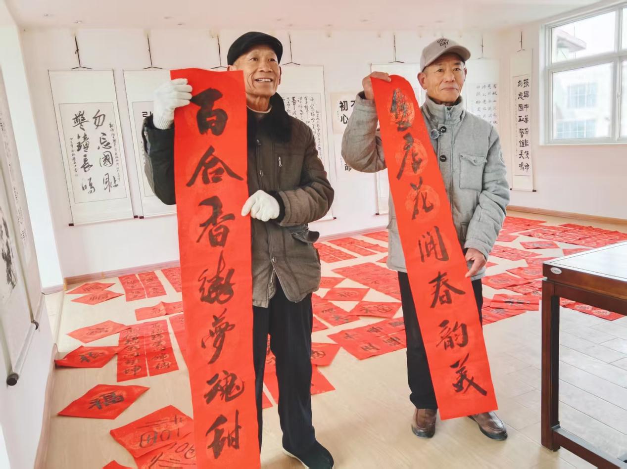 他们是多才多艺的一群人,不仅热爱书法,还热爱绘画,写的春联内容大多来自原创,让人看上去眼前一亮!“高效农业越种越带劲,百姓日子越过越红火”“双店花开春韵美,百合香绕梦魂甜”,一条条的春联佳句,尽情展现新农村新变化和党的富民好政策,紧跟时代的发展脉搏,抒发内心情怀。“网上春联一箩筐,自己创作更亲切,我就爱琢磨,把咱们新农村的变化、田埂上的故事写进春联里。”中国老年书画研究会会员、离退休老干部王相田如是说。