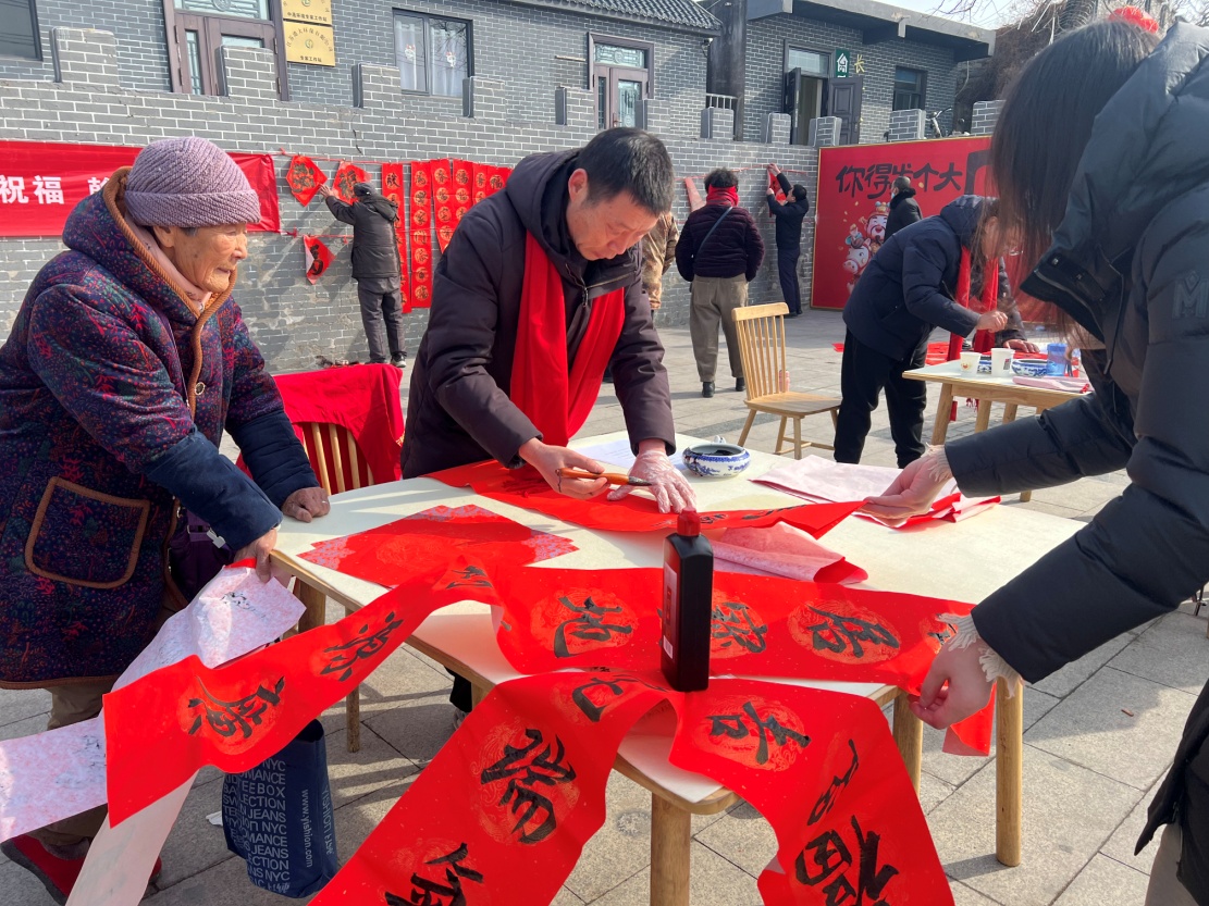 一副副红彤彤的春联整齐悬挂在古城门的立柱上,为千年古迹披上喜庆红装——城门如一位守望岁月的老者,又似一位拥抱新生的少年,承载着文明新风的蓬勃生长。一位参与活动的居民李女士手持墨迹未干的春联,欣喜地说道:“以前常来城门看风景,今天能在这里亲手写春联、领到书法家的墨宝,还学到了移风易俗的新知识,这种让传统文化‘活’起来的活动太有意义了!”