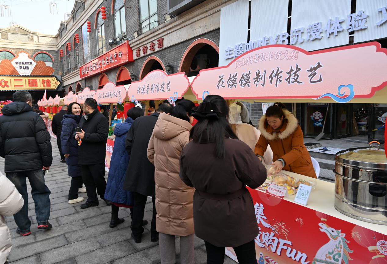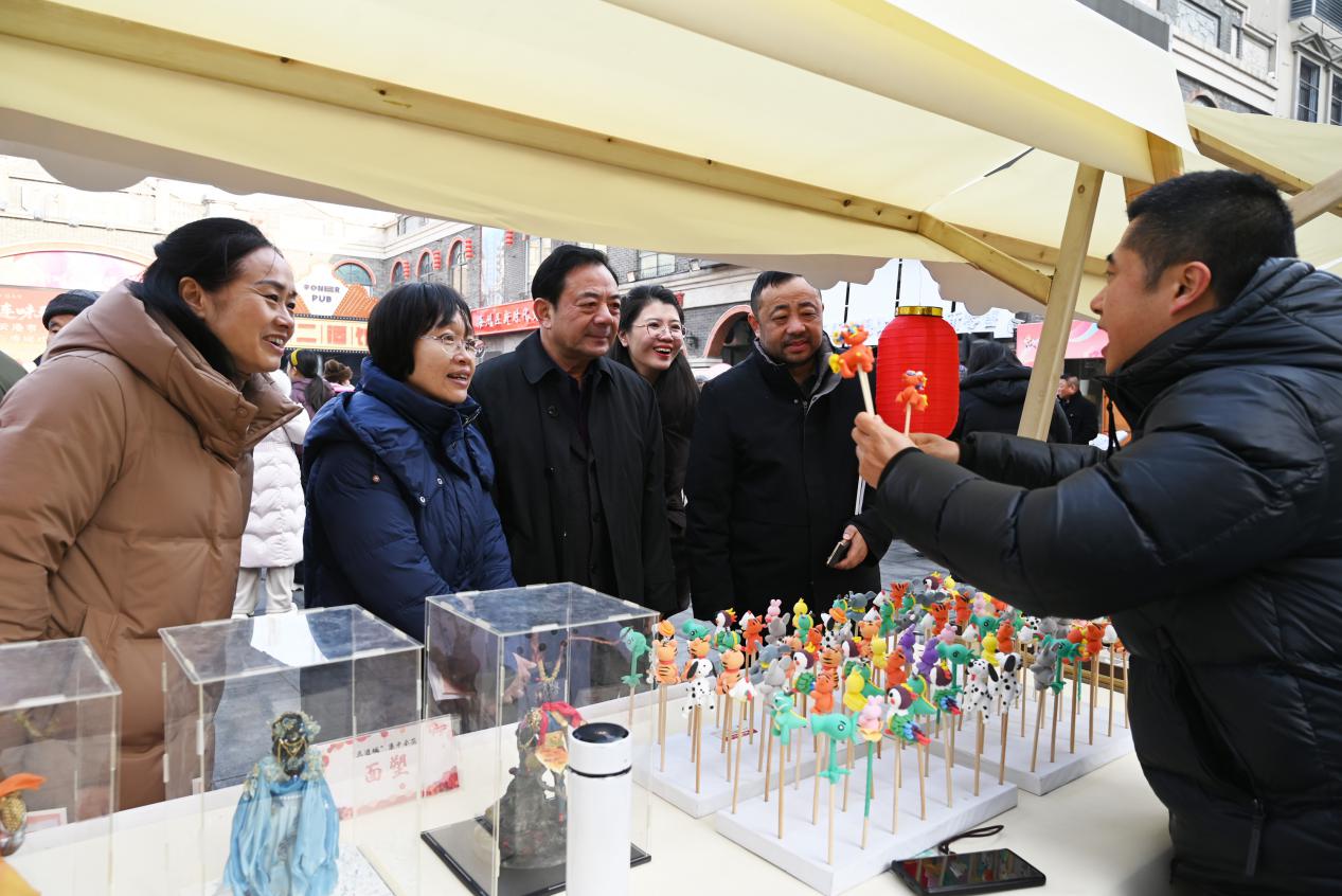 浓厚的年味更体现在可触可感的体验中。在“非遗潮购区”,市民游客不仅能选购地道的本地特产,还能亲手体验剪纸、捏面人、风筝彩绘等技艺。传统医药展示区让健康养生智慧与非遗技艺生动可触。带着孩子体验面塑的张女士感慨:“以前过年就是吃和逛,现在孩子能亲手做一件‘非遗’带回家,这个年过得更有意义了。”