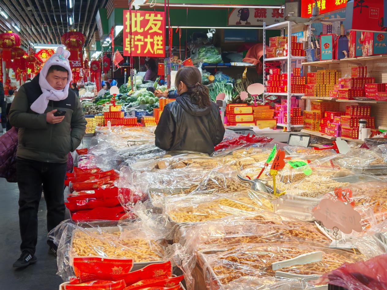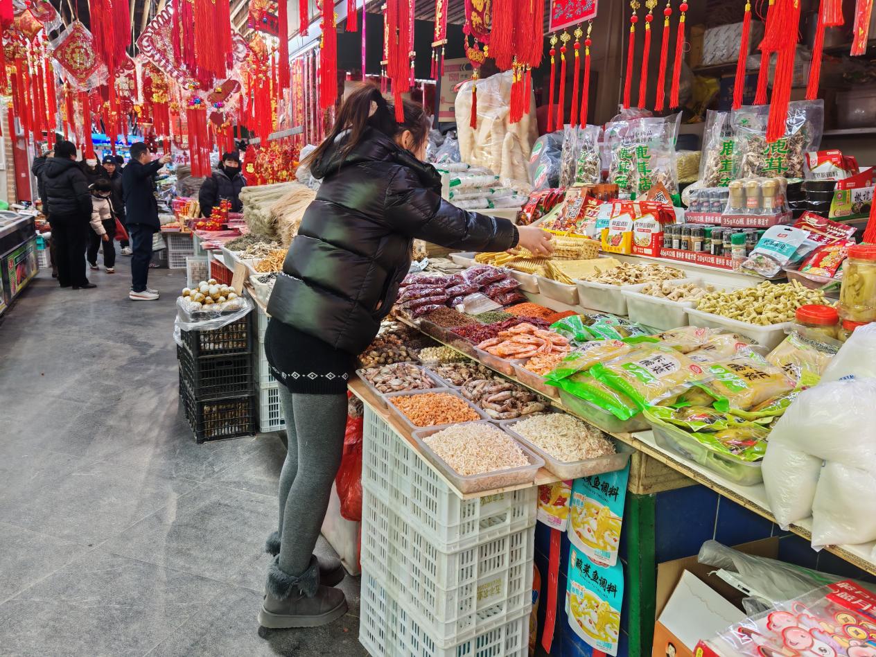 炒货摊飘着瓜子花生的焦香,熟食摊卤味诱人,豆制品、水产等摊位前也都人头攒动。糕点摊前排起了队,吉阿姨熟练地打包米花糖、糖果子等年节点心。“每年就盼这段日子,”她边忙边说,“这些传统糕点过年最受欢迎,虽然累,但看着大家热热闹闹备年货,心里高兴。”