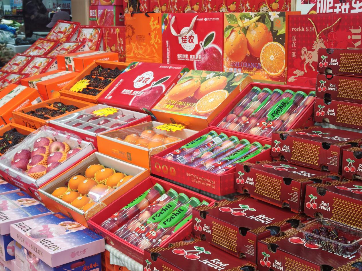 七点一过,第一拨顾客涌进。家庭主妇提着布袋,老人拉着小推车,上班族趁着晨间匆忙采购——寂静的市场瞬间沸腾。水果店里,成箱的车厘子、草莓和砂糖橘格外抢眼。“水果礼盒最近卖得好,”摊主祝大哥边称重边说,“走亲访友都爱拎一盒,车厘子价合适,不少人整箱买。”