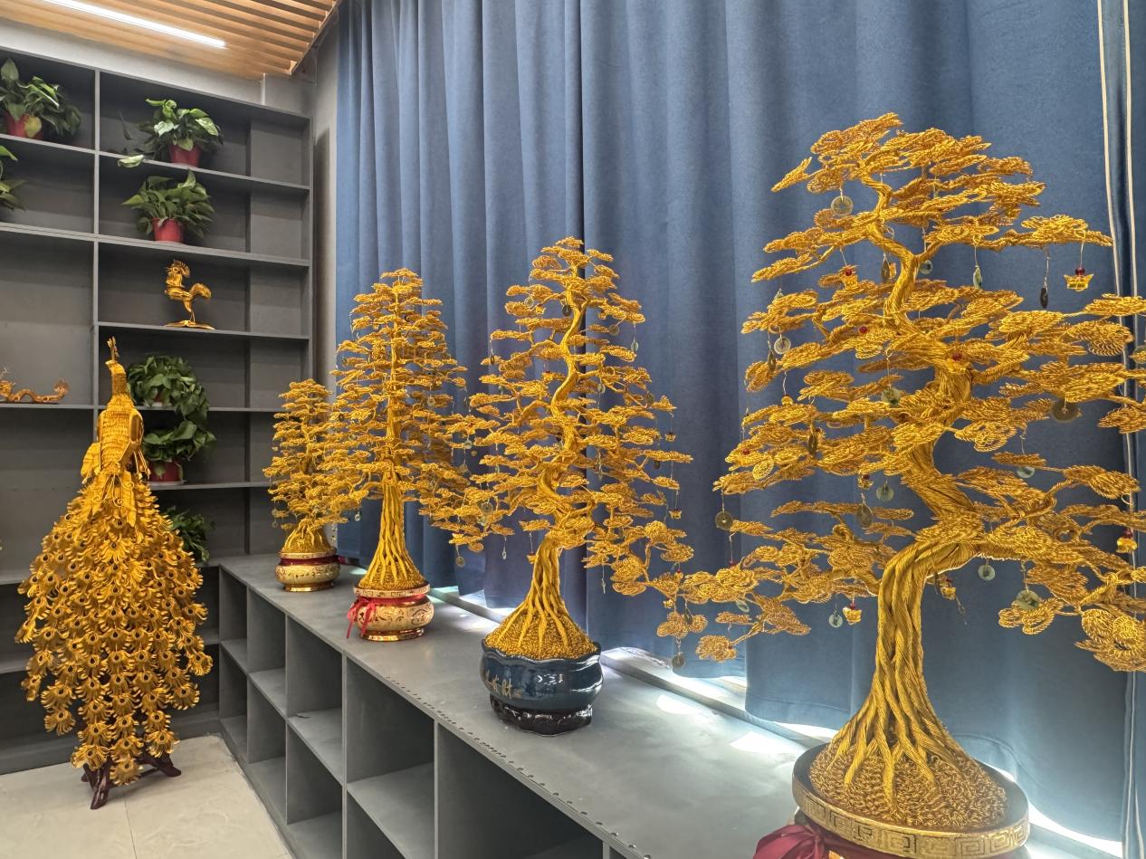 如今,金鑫的作品不断创新,“发财树”不仅造型精致,还设计了可自行添加的挂件,“发财树咱们做好后,顾客收到货可以自己往上添挂件,图的就是‘自己添财气’的好寓意。”他说,新春期间这类作品格外畅销,“像这种大一点的摆件,过年大家都喜欢摆在家里客厅,金碧辉煌的特别好看。”除了“发财树”,他还自主设计了孔雀开屏、中国龙等作品,更耗费数月打造出西游京剧版猪八戒、沙和尚、孙悟空、唐僧师徒四人系列,造型精致、色彩搭配美观,尽显特色。