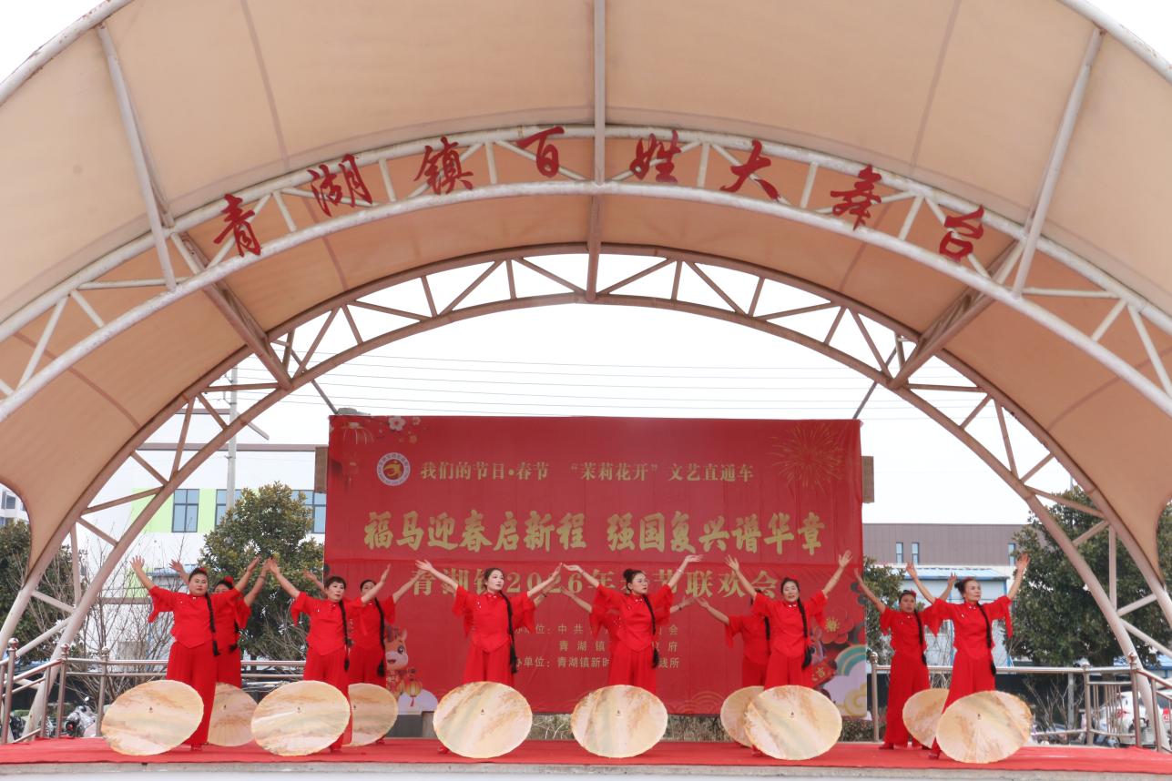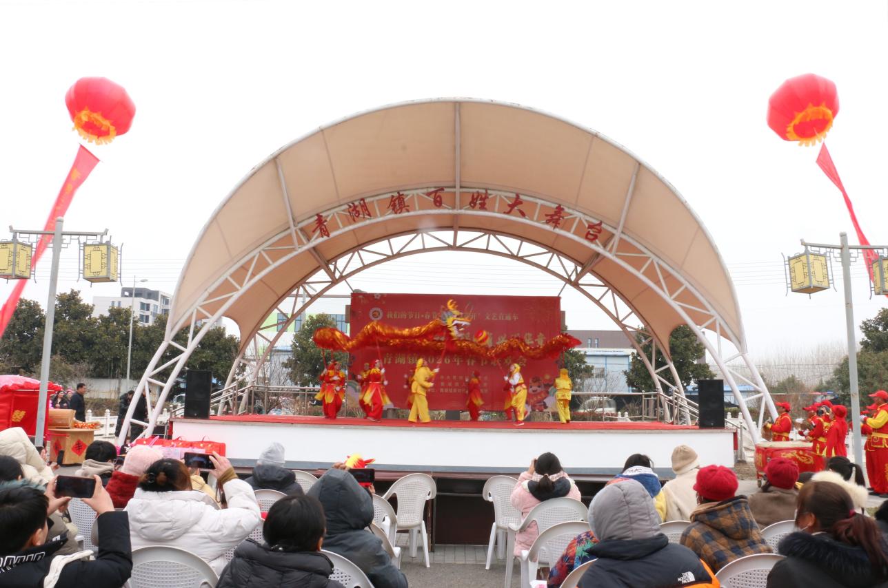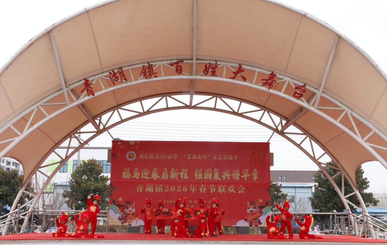 台下开集,台上演出。2月10日下午,在青湖镇新时代文明实践所的百姓大舞台上,一场以“福马迎春启新程、强国复兴谱华章”为主题的春节联欢会热闹开演,吸引了广大群众前来观看。演出现场彩球飘扬、音乐欢快,营造出了喜庆祥和的节日氛围。随着锣鼓声铿锵响起,整场演出在非遗项目《舞龙》表演中拉开序幕,让现场观众感受到了中华传统民俗文化的独特魅力。歌舞《花开中国》《中国美》《精忠报国》,抒发了对祖国的赞美和热爱之情;戏曲选段《马大宝逛新农村》、独唱《庆丰收》、舞蹈《新年快乐》《天天好运来》等节目,表达了人们对家乡发展成果的讴歌以及对幸福美好生活的期许;幼儿园里的孩子们表演的舞蹈《快乐的小骏马》,充满天真童趣的稚嫩动作让台下观众笑得合不拢嘴。