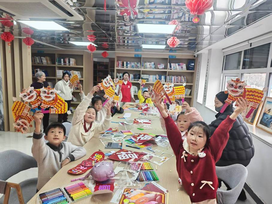 巧手生趣·二楼书房变身“手工小工坊”。手工制作区里,孩子们化身“小小传承人”,在社区工作者和大学生志愿者的指导下,认真裁剪、粘贴、组装。红色卡纸与金色贴纸在指尖翻飞,不一会儿,一个个“福”字挂饰便跃然掌上。卡纸舞狮区格外热闹,两脚钉固定狮头、小纸棒撑起狮身,孩子们举着亲手制作的“小醒狮”摇头晃脑,神气十足。春联涂色卡前,稚嫩的笔触为空白春联添上五彩新衣。一盏盏福字、一只只舞狮、一副副春联,将新春的祝福与童真的创意紧紧交织。