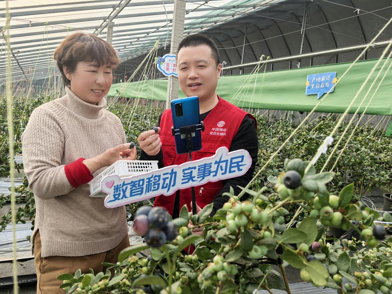 中国江苏网讯 近日,连云港市赣榆区塔山镇头茬蓝莓陆续成熟,一串串饱满圆润、色泽鲜亮的蓝莓挂满枝头,成为新春市场的“应季鲜品”。为助力种植户拓宽销售渠道、提升销量,中国移动江苏公司连云港分公司(以下简称连云港移动)“移家人”志愿者走进当地蓝莓种植园,开展直播助农活动,以数字化力量为乡村振兴注入动能。