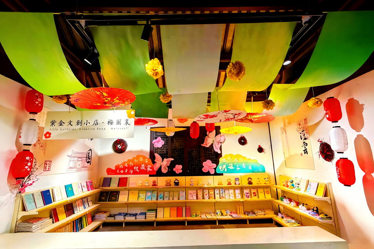 除了主题活动之外,值得一提的是,由紫金文创精心打造的灌云梅园景区文创小店正式焕新营业,文创小店推出梅园定制棒棒糖、灌云伴手礼毛绒玩具礼盒等一系列特色文创产品。店内空间设计独具匠心,翠绿绸幔搭配朱红灯笼、油纸伞错落点缀,与窗外的万亩梅林相映成趣,营造出“人在景中、景藏店中”的沉浸式氛围。