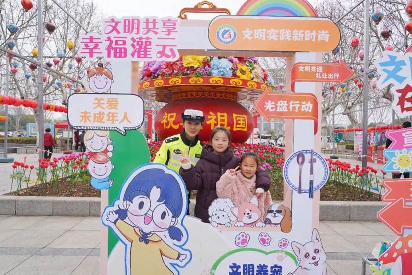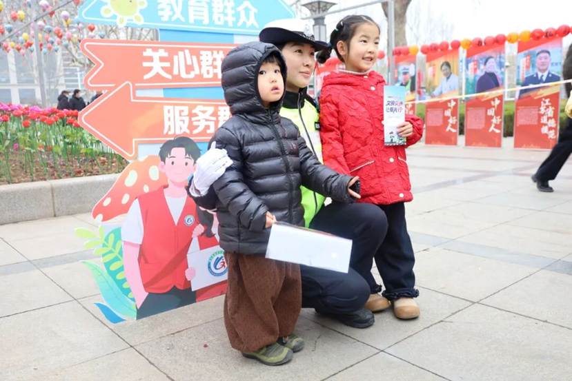 与此同时在打卡区,交警姐姐正蹲下身子,与小朋友们亲切互动。他们耐心讲解交通规则,带领孩子们一起摆出可爱姿势合影留念。