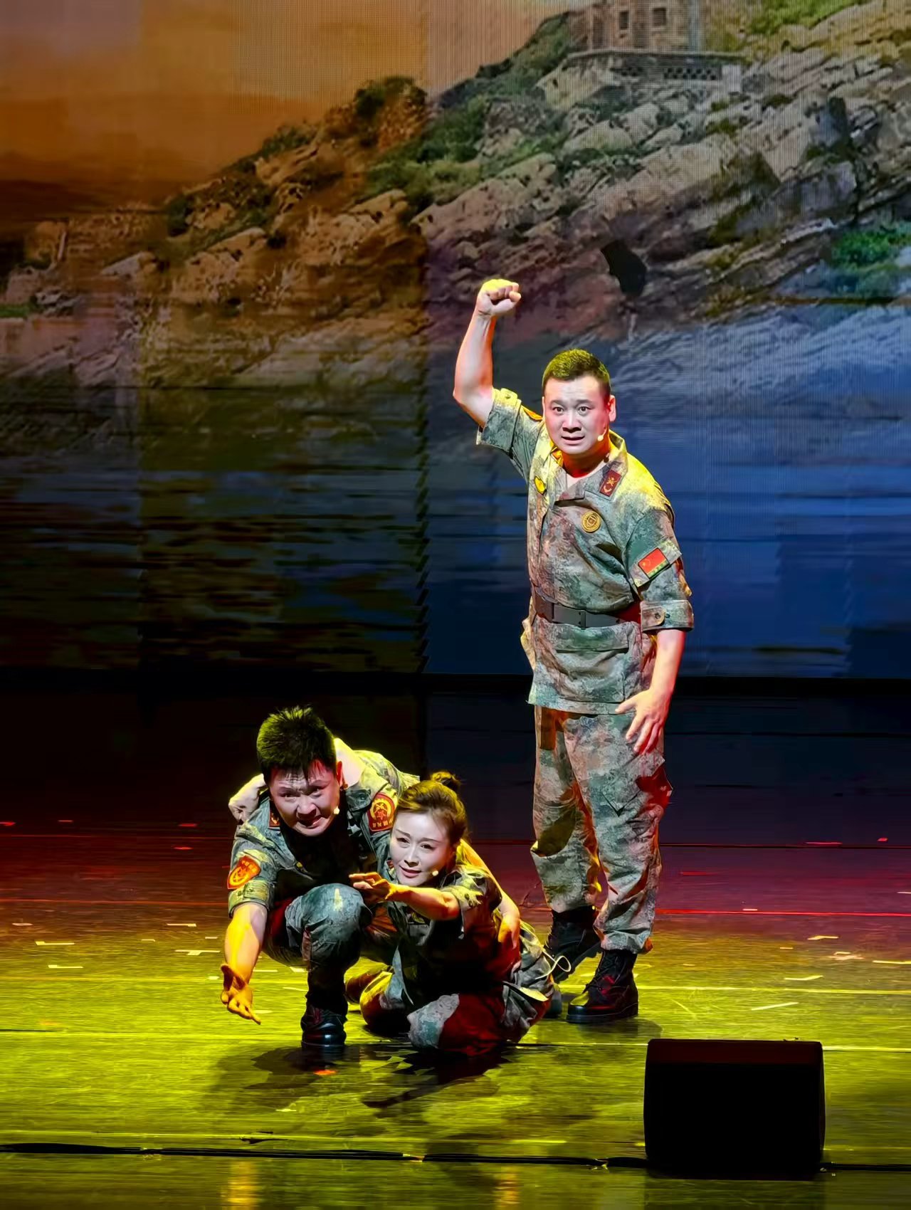 演员们舞台表现极有功力,在说与演的角色转换中恰到好处、恰如其分,如波推浪涌,如潮起潮落,把人物生命的律动与自然的律动合拍,实现了场上场下、台前幕后的齐动、联动、互动。选准一个典型的生活细节,精心勾画人物的鲜活形象,让人物美好丰富充盈的内心世界如莲绽放,塑造可信可感血肉丰满的人物形象,展现他们不平凡的精神世界,放飞以爱国主义为核心的民族精神,实现符合时代需求的审美表达和传播价值的迅速转化。英雄主义直抵人心的力量,来自真实,来自现实土壤,来自人间烟火,来自深沉的家国之爱。台风之夜、临盆之际、风雨交加、无船靠岸,守在电话机前,王继才完成了接生重任。生生不息,这是一种人间大爱,这种大爱脱胎于“家就是岛,岛就是国”这一坚定人生信念。这是爱国主义内化于心、外化于行的当代精神展演!32年守岛爱国坚定意志的背后是祖国永在我心的忠贞不渝。祖国高于一切,英雄引领民族义无反顾、奋勇前行。