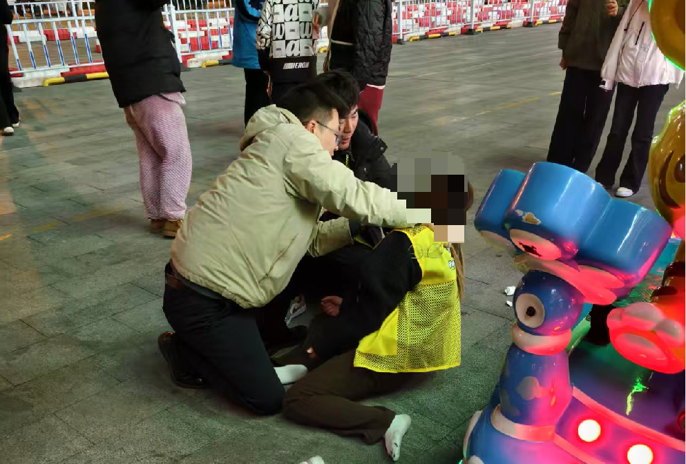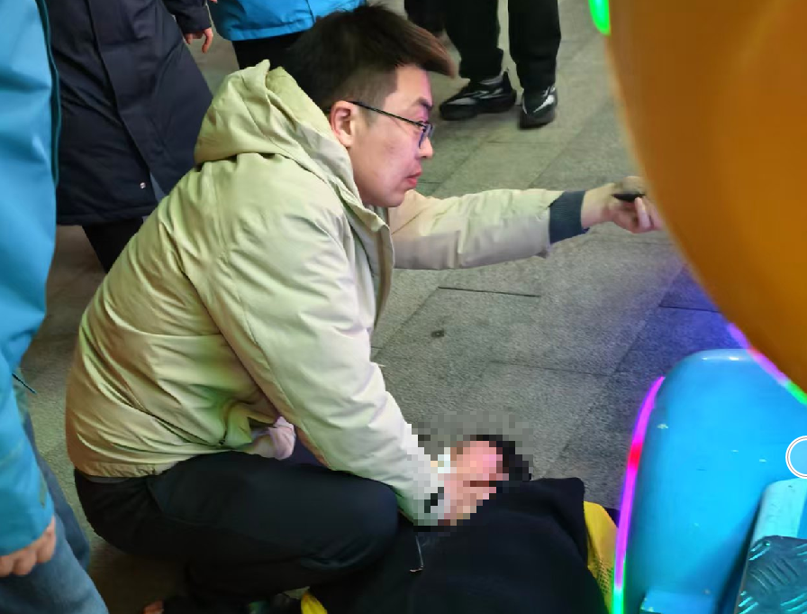 胡其生始终保持跪的姿势,身体前倾专注施救,全然不顾地面的寒凉与周围的嘈杂。他一手托住患者头部,一手进行相关急救操作,神情专注而坚定,用扎实的专业素养和冷静的处置为患者筑牢生命防线。在等待120救护车抵达的过程中,他始终守在患者身边,不断观察病情变化,确保急救流程规范有序。直到急救人员到达现场,完成交接后,他才默默起身离开,没有留下姓名,只留下一个温暖而匆忙的背影。