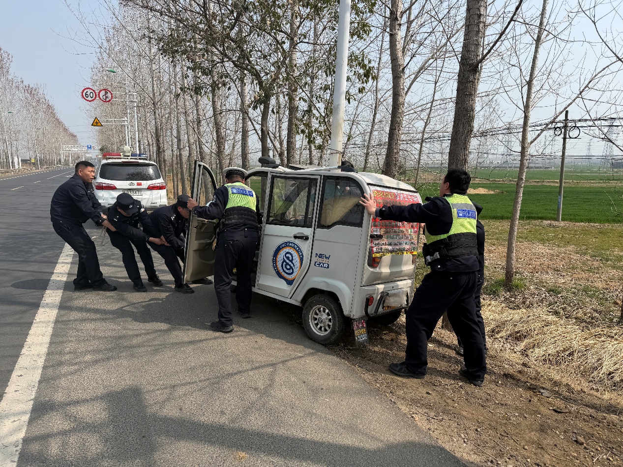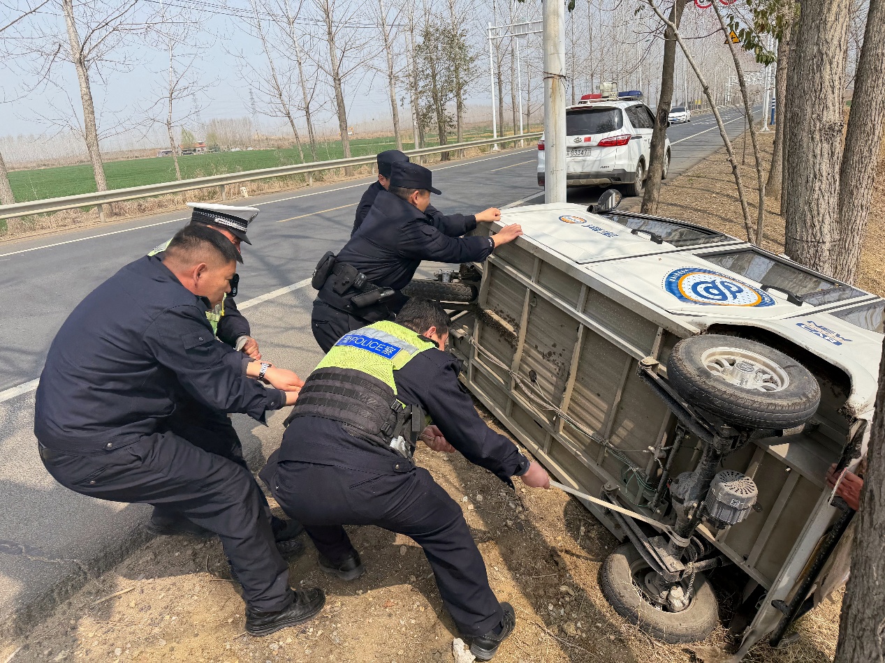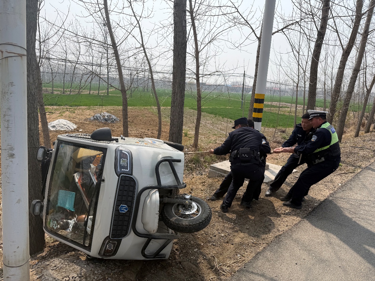 巡逻民警辅警立即上前查看情况,经了解,老人驾驶三轮车行经该路段时,因一时犯困而导致操作不当造成车辆侧翻,所幸老人并未受伤。民警一边安抚老人情绪,一边试图合力将侧翻的三轮车推正。然而,几人弯腰弓背,双手撑住车身,用劲几次尝试,三轮车却因车身较重、车内又满载货物而纹丝不动。