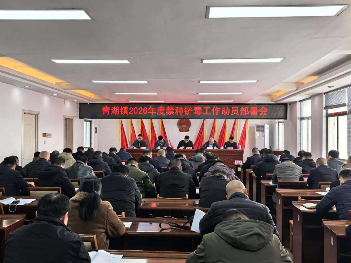 青湖镇始终将禁种铲毒工作作为一项重要政治任务和民生工程,高站位统筹谋划,压紧压实镇村两级干部责任。青湖镇党委、政府第一时间召开禁种铲毒专项工作部署会,成立由镇主要领导牵头的专项行动领导小组,制定印发《青湖镇2026年禁种铲毒工作实施方案》,明确工作目标、实施步骤及责任分工。镇政府与各村签订《禁种铲毒目标责任书》,将禁种铲毒工作纳入乡村治理重点内容。各村同步组建以村党组织书记为组长,村干部、网格员、志愿者、入党积极分子等为成员的工作专班,构建“镇统筹、村落实、组联动、户参与”的四级工作体系,确保责任层层传导、工作落地见效。