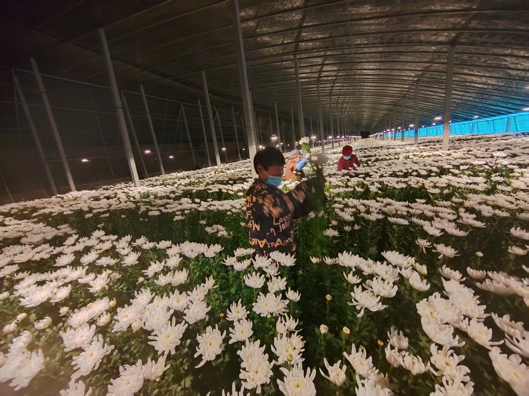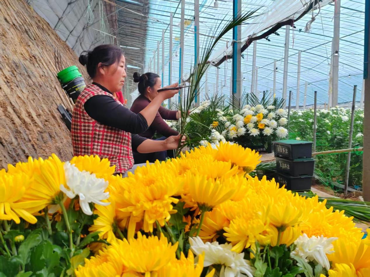 苗春燕每隔两天,采一次菊花,一次能摘2万枝。采摘的时间很讲究——晚上6点到10点,趁着夜色,她和家人打着手电筒在大棚里忙碌。连夜包扎、整理,一大早便送到当地的鲜花交易市场,通过物流的方式,当天就能运送到江沪浙等地区。