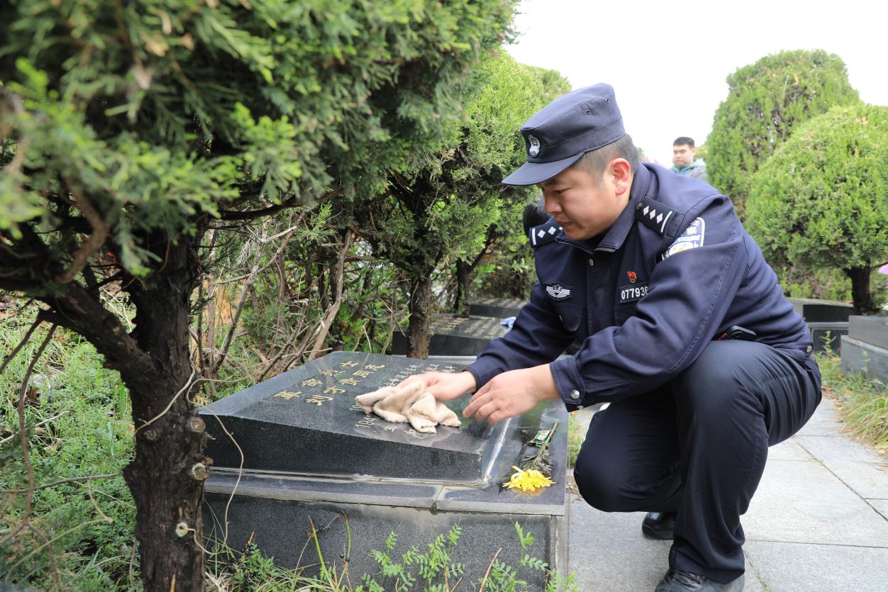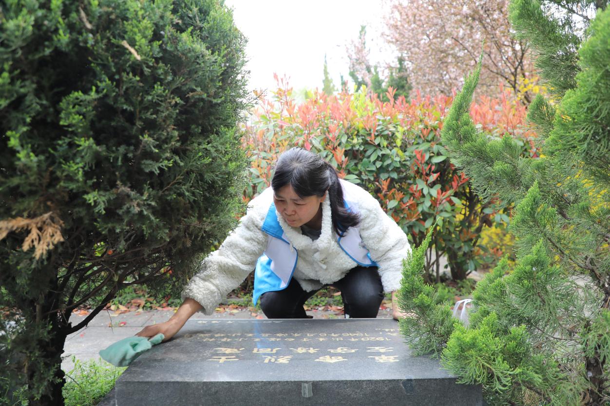 在随后的祭扫环节中,志愿者们俯身于烈士墓碑前,仔细擦拭墓碑上的尘埃。人群中,志愿者左海霞跪坐在一座墓碑前,久久不愿起身。这里长眠着她的亲人——革命烈士左守栋。
