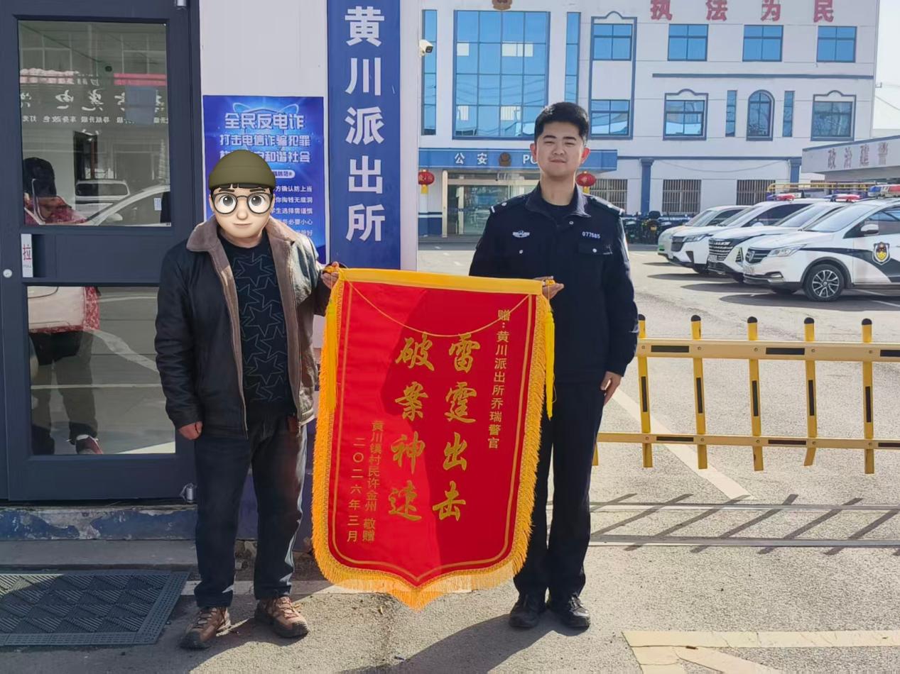 许某对民警快速高效、认真负责的工作作风深受感动,特意将一面印有“雷霆出击 破案神速”的锦旗送到派出所。