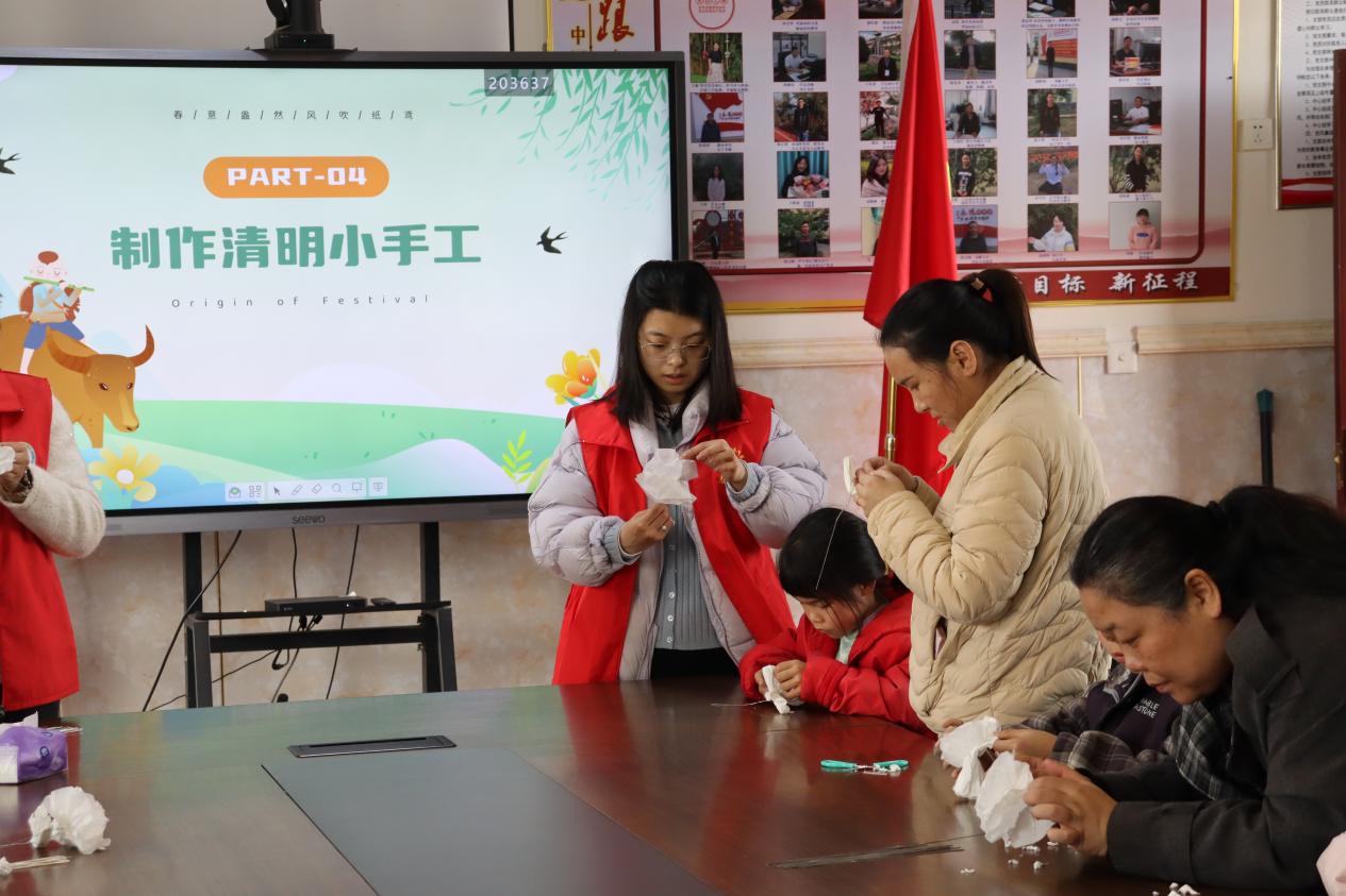 活动伊始,“爱心妈妈”们为孩子们带来了一堂生动有趣的清明节主题课。课堂上,“爱心妈妈”围绕清明节的由来、传统习俗展开细致讲解,从扫墓祭祖、踏青插柳,到荡秋千、放风筝、植树,一个个鲜活的习俗让孩子们对传统节日有了更直观的认识;同时讲述介子推的经典传说,带领孩子们诵读《清明》《寒食》等经典古诗,在诗声中感受中华传统文化魅力。讲解结束后,大家一同开展清明手工制作,孩子们在“爱心妈妈”的指导下认真创作,一张张卫生纸在手中变成精致的纸花,不仅锻炼了动手能力,也为后续祭奠英烈做好了准备。