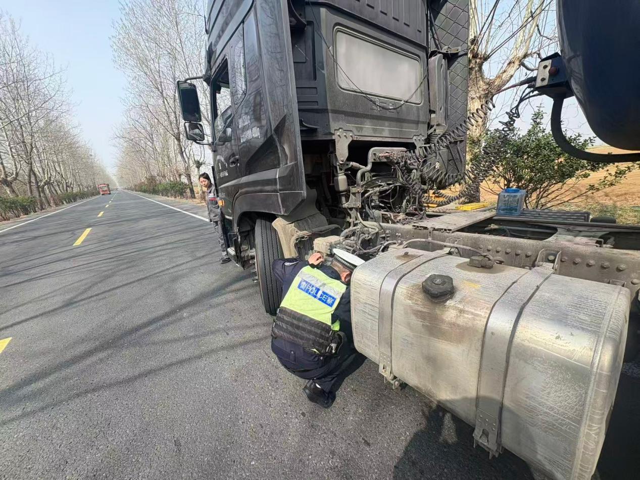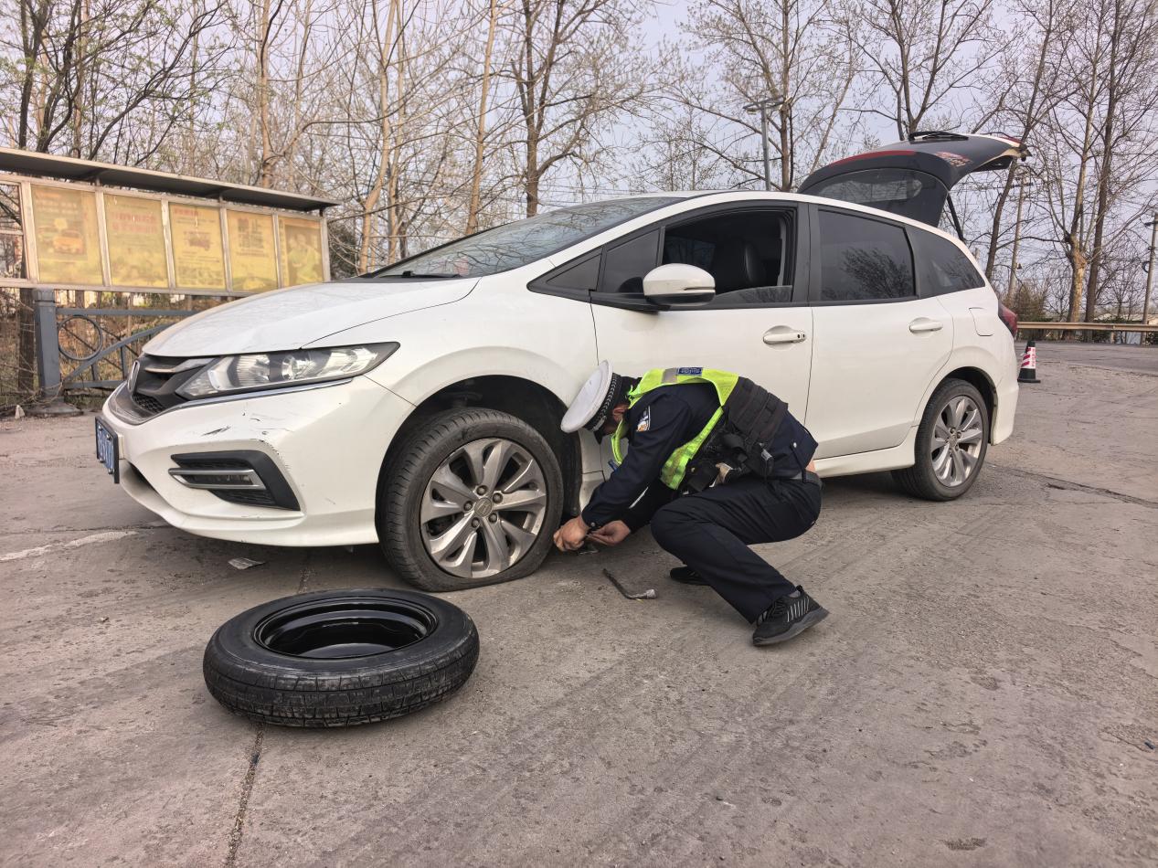 桃林中队民警巡逻至310国道时,发现一辆货运车开着双闪停在路边,存在较大安全隐患。经了解,该车从黑龙江开往河南,行驶至此突发故障,刹车抱死,轮毂冒出白烟,情况危急。民警迅速联系附近修车铺前来抢修,在车辆后方规范放置锥形桶、设置警示区,提醒过往车辆减速避让。民警辅警一直守护现场,直至故障排除、隐患消除,才继续执行巡逻任务。4月4日,鲁女士驾驶小型客车沿310国道行驶至官庄检查站附近时,左侧车轮压到路边石头导致爆胎,桃林中队巡逻发现后,同样第一时间伸出援手。(袁青青)