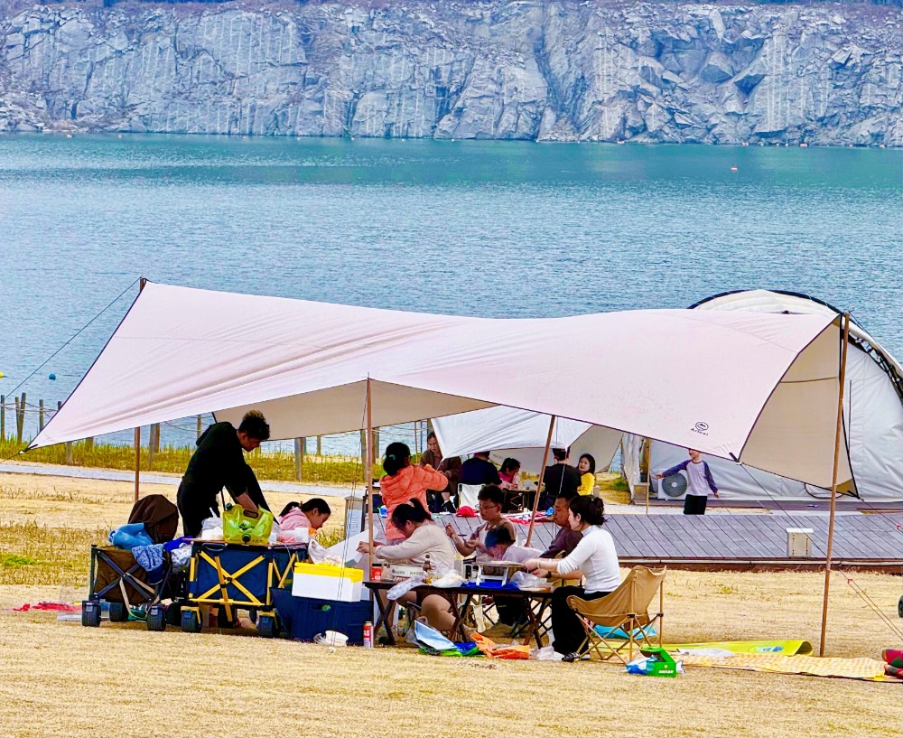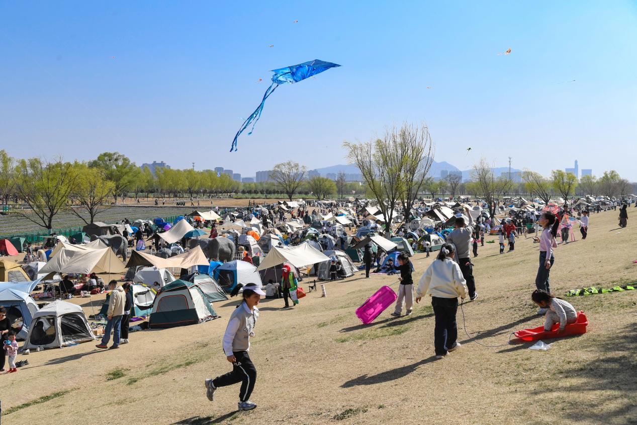 在月牙岛南岛,蓝天下,各色小帐篷星罗棋布地散落在草地上,与周边抽芽的垂柳构成一幅灵动的春日画卷,市民们围坐在一起,分享美食、畅谈闲聊,孩子们在草坪上奔跑嬉戏、放风筝,一派惬意祥和的景象。