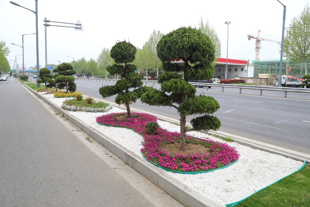 本次绿化提升行动累计投入资金200万元、工人40多名、机械车辆20台。在绿化提升作业中,该中心采用常绿植物搭配彩叶植物的栽植模式,着力营造“四季常绿、三季有花”的自然景观。目前,在侧分带新植草坪6400平方米,利用龙柏球、木槿、紫荆等绿化,在沿线打造绿化景点12处,新植五针松、金边黄杨、黑松等500多株,并搭配女贞、红叶石楠等彩叶苗木。当前新栽苗木长势稳定,已形成初具规模的绿色景观带。为提升景观效果,利用白色砾石和石英石,布置景观石28处,搭配景观花镜122平方米。在绿化提升同时,该中心还更新破损的路缘石1500米,更换排水系统,修复人行道铺装400平方米,在迎宾广场立桥上实施墙体彩绘,以靓丽的交通环境、精致的景观迎接省运健儿和八方宾客。