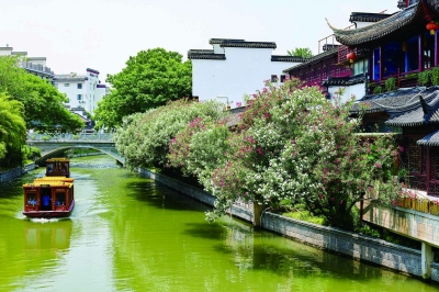 昨天,夫子庙秦淮河畔,层层叠叠的夹竹桃临水绽放,白色和红色的花朵映衬着青瓦白墙,水光潋滟中更显江南水乡别具特色的生态美景。
