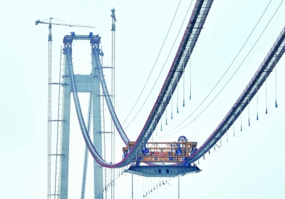 昨天,由南京市公建中心建设,中交二航局承建的仙新路长江大桥首榀钢箱梁成功吊装,标志着大桥进入上部结构安装新阶段。南京日报/紫金山新闻记者 徐琦 摄