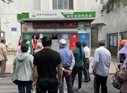 第一站参观青东苑小区:参观小区垃圾分类收集点,介绍小区分类收集点的定时定点投放要求、常见四分类垃圾种类、四分类容器标识,切实提升居民对垃圾分类知识的了解。