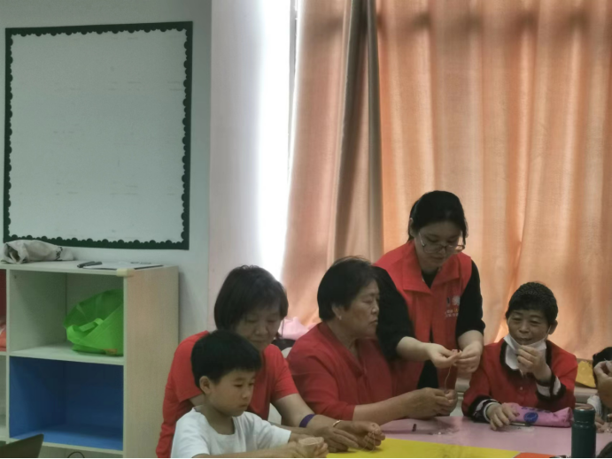 接下来,志愿者与居民共同参与端午节的“招纳福避千邪”手工挂件制作活动。分发各色珠串,演示手工挂件的制作过程,居民们纷纷动起手来,手工挂件在端午节有“驱邪岁,筑安康”的美好祝愿,在制作中,居民们互帮互助,制作完成后将挂件挂在手机上,预示端午节的平平安安。