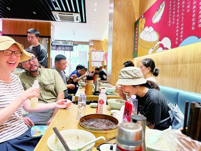 店里,美国游客Lauren正带着孩子品尝汤包、鸭血馄饨等南京美食,“这次是来南京探亲、旅游,我觉得南京美食非常好吃,小孩也很喜欢。”