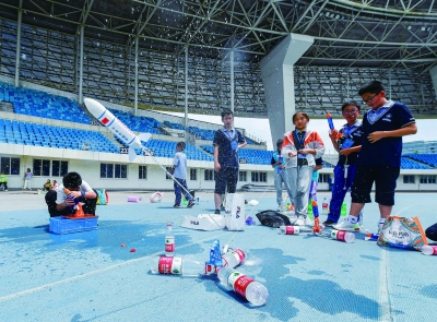 昨天,2023年“飞向北京·飞向太空”全国青少年航空、航天模型教育竞赛(江苏省总决赛)在南京爱飞客航空运动科普基地举行,来自全省的青少年们在橡筋动力扑翼机、遥控纸飞机等项目中展示自己的科学创造力和飞行技能,享受体育竞技的乐趣。图为小水火箭距离挑战赛比赛现场。南京日报/紫金山新闻记者 孙中元 摄