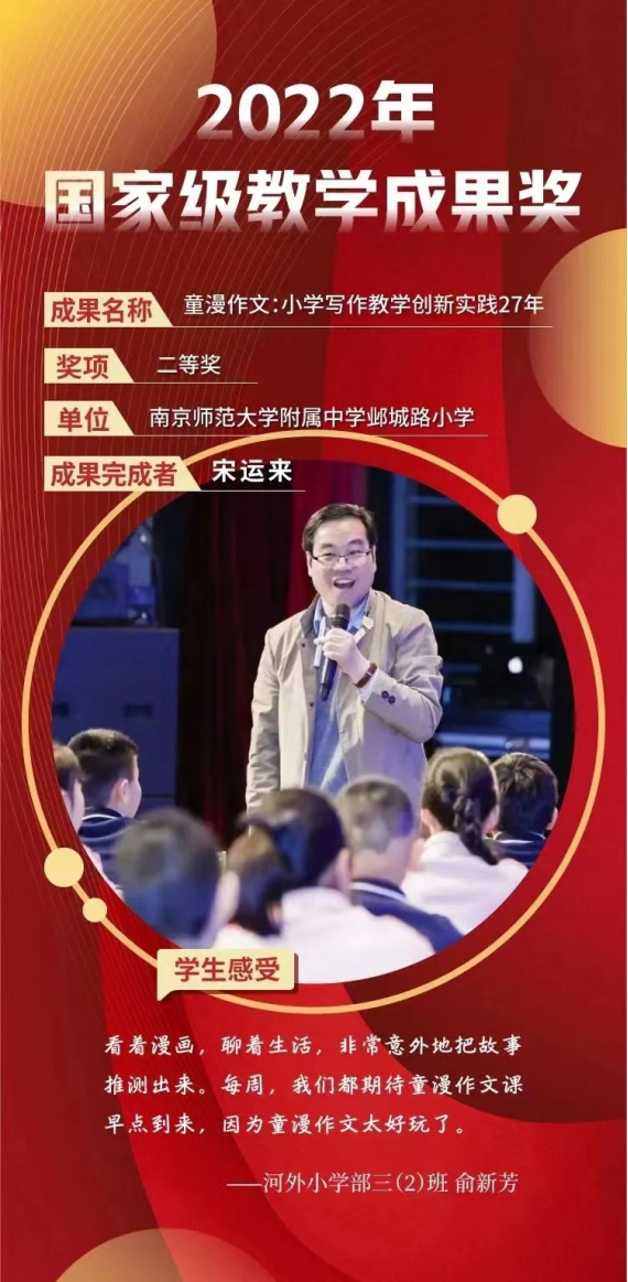 建邺夺得的3项国家级基础教育教学成果奖中,鹤琴幼儿园张俊申报项目《成就“活教师”:陈鹤琴活教育思想引领下幼儿园青年教师成长的创新实践》荣获一等奖,金陵中学实验小学魏光明申报项目《小学数学起点型核心知识体系建构与教学创新》荣获二等奖,邺城路小学宋运来申报项目《童漫作文:小学写作教学创新实践27年》荣获二等奖。