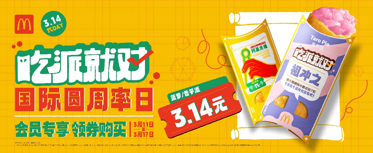 今年,麦当劳派DAY以“吃派就对,致敬派学家”为主题,用美味致敬3月14日国际圆周率日。不仅通过限定包装等有趣的内容和粉丝们一起纪念探索过π边际的数学先驱,也配合更多丰富的活动,邀请现实中吃派、爱派的消费者参与庆祝。
