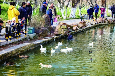 昨天,气温回暖,春天的气息愈发浓厚。成群结队的柯尔鸭、黑水鸡、黑天鹅等水禽在莫愁湖中悠闲游戈、惬意觅食,呈现出一派“春江水暖鸭先知”的和谐生态画卷。