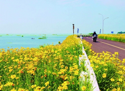 昨天,高淳石臼湖南岸的圩堤上,金灿灿的金鸡菊随风摇曳,长长的金色花带像一条项链镶嵌在石臼湖畔,璀璨夺目。 通讯员 魏宏伟 南京日报/紫金山新闻记者 段仁虎 摄
