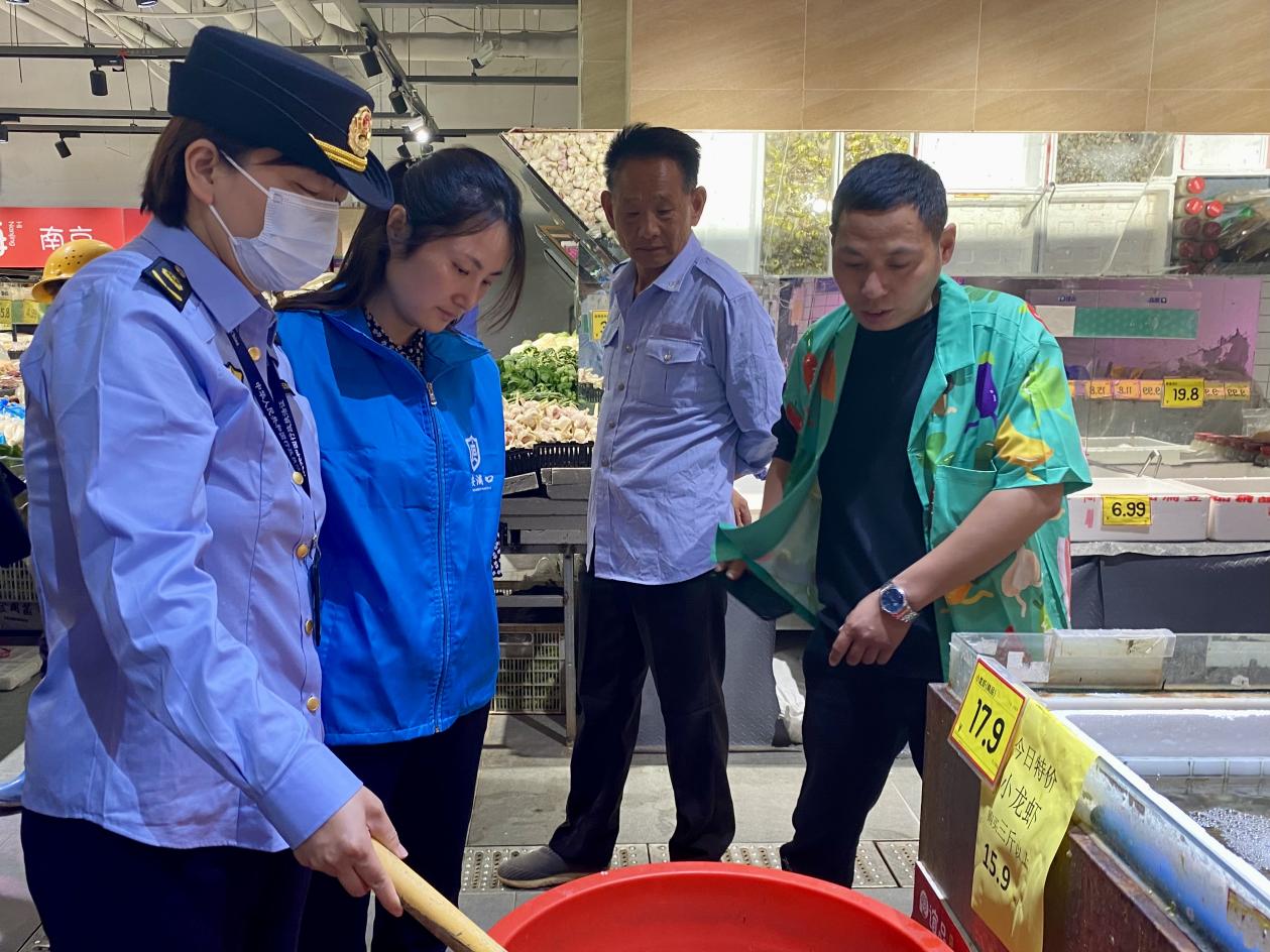在农贸市场和生鲜超市,执法人员查看龙虾销售商户进货票据是否齐全、进货商是否具备资质,龙虾价格是否规范公示,计量用具是否按规定校验合格,并用砝码现场称量是否存在缺斤少两等问题,督促经营户落实主体责任。