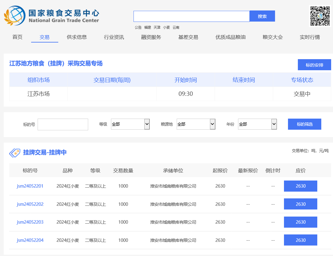新华报业·新江苏讯 5月20日,江苏一储备收储企业在南京国家粮食交易中心以采购底价2630元/吨,成交价2580元/吨的价格完成了一笔2024年产1300吨普通红小麦的采购交易,先后经过5家农户自然人11轮的竞价以最为贴近当前的市场行情的价格成交。