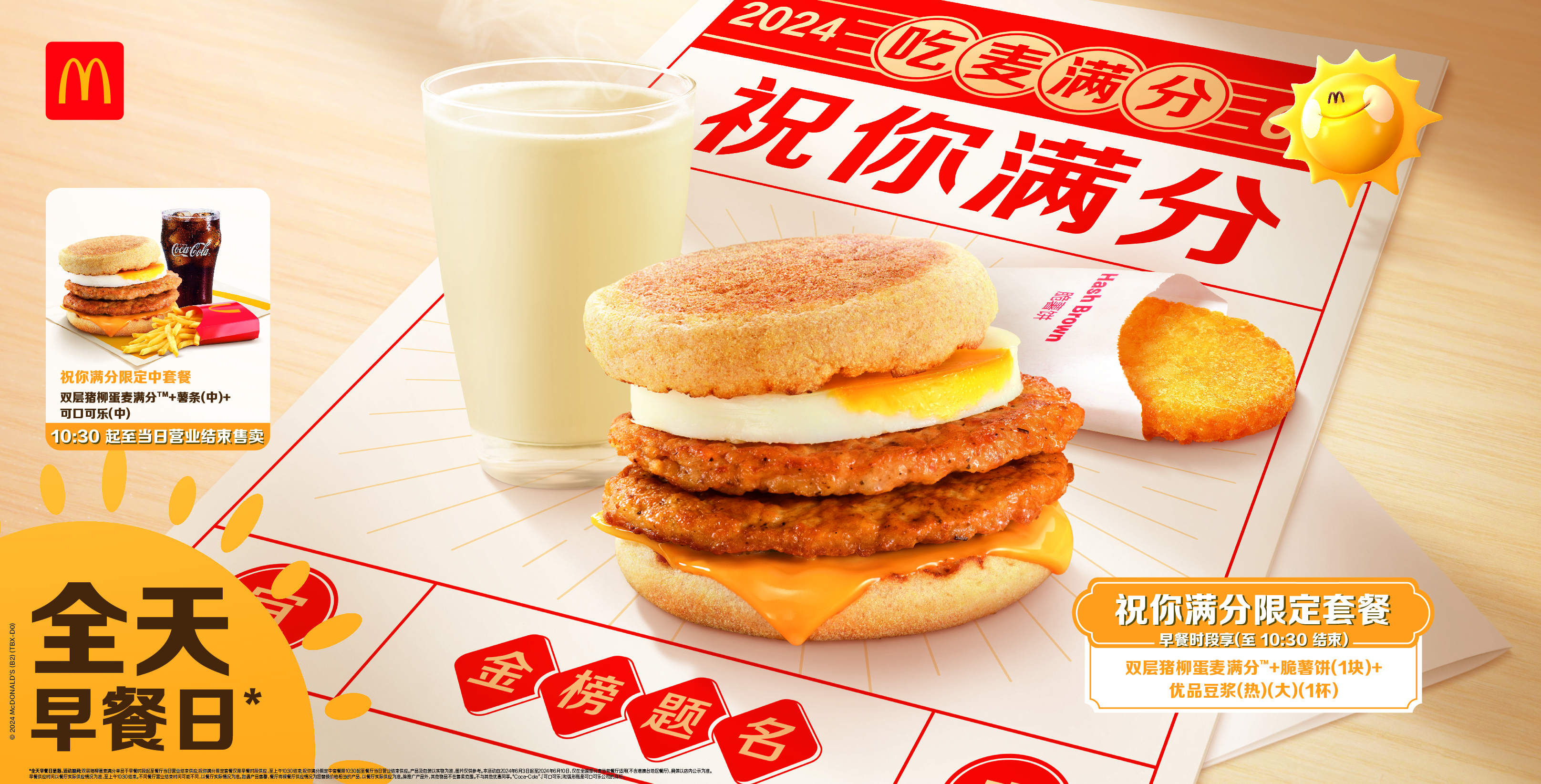 麦当劳中国开启全天早餐日,双层猪柳蛋麦满分全天售卖,为考生送上满分祝福