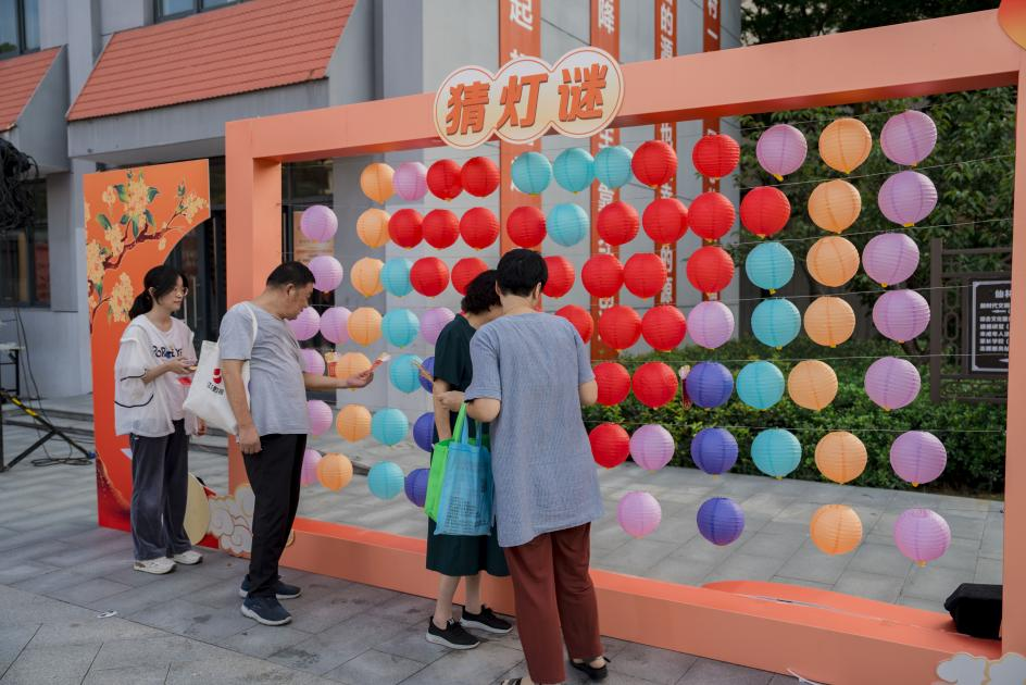 在本场活动文艺表演之前就有游园会,现场欢快的音乐吸引了许多仙林新村小区的居民,包括许多放学的孩子们。游园会现场设置了灯谜、套圈、“月兔吃月饼”、“后羿射日”等游戏,小朋友争先来玩,乐在其中。在游戏中赢得的兑换券可以到手工展览的区域兑换民俗手工艺品、糖人、小灯笼等奖品。不一会奖品就兑换完了。