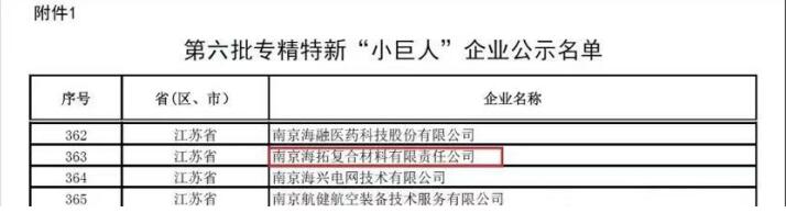 近日,第六批国家级专精特新“小巨人”企业名单公示,溧水共有6家入围。其中,位于南京市溧水区东屏街道的南京海拓复合材料有限公司成功入选,这是海拓公司继去年成功获得省级专精特新企业认定后的又一重大标志性突破。