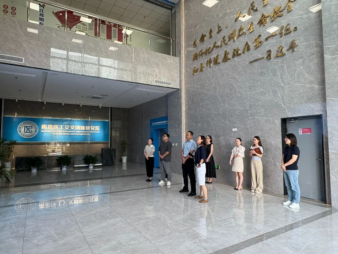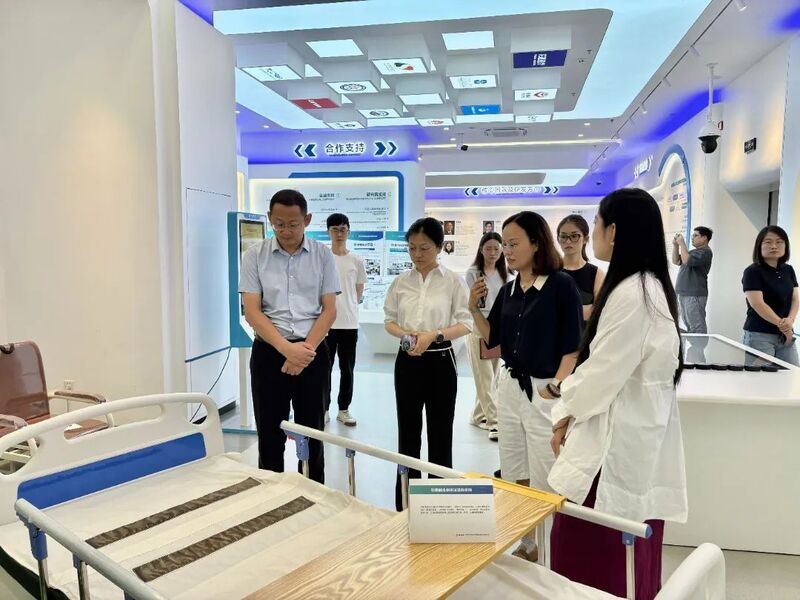 在医工交叉研究院,一行人重点参观了南京市首家在医疗器械领域获得CNAS认证的第三方临床前大动物试验中心。该中心作为医疗器械研发链条上的关键环节,凭借国际认可的检测能力,为创新医疗器械从实验室走向临床提供了坚实的安全评估支撑。大家还近距离接触到多项前沿成果——其中运用“床单”式电极的非接触式生命体征监测技术项目令大家眼前一亮,这种将传感技术融入日常织物的创新设计,可在不接触人体的情况下精准捕捉心率、呼吸等生命体征数据,为医疗护理场景带来全新可能;同时展出的各类医药器械,从智能给药装置到便携康复产品,涵盖了健康管理全链条,也让大家直观感受到医工融合技术对民生健康的生动赋能。