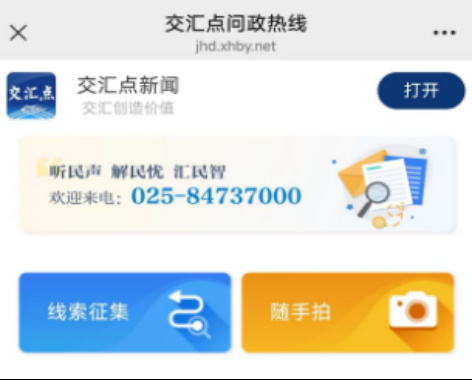 新华日报・交汇点讯 在原有025-84737000热线电话基础上,新华日报・交汇点新闻“问政热线”小程序正式上线。此次升级新增“线索征集”文字留言、“随手拍” 图片和视频上传通道。只要打开“交汇点”新闻客户端首屏,即可点击进入“问政・热线”板块,就可便捷参与问政互动。