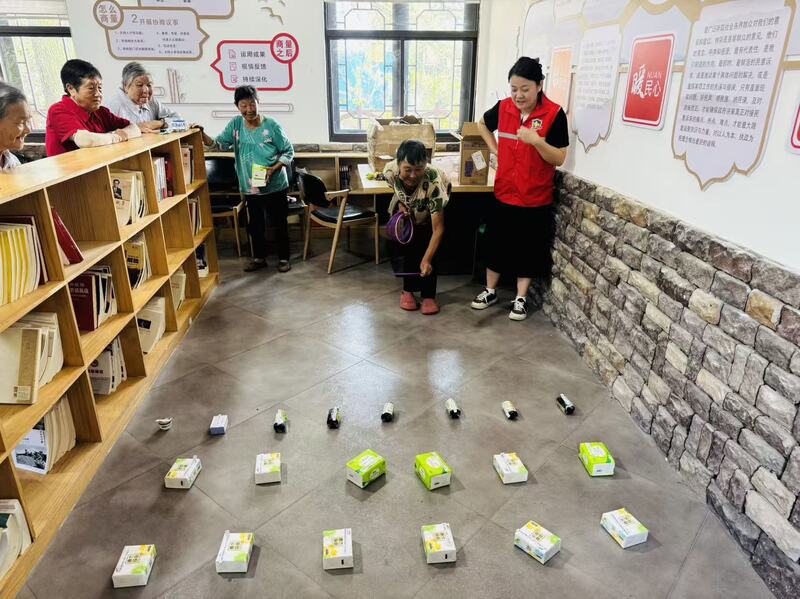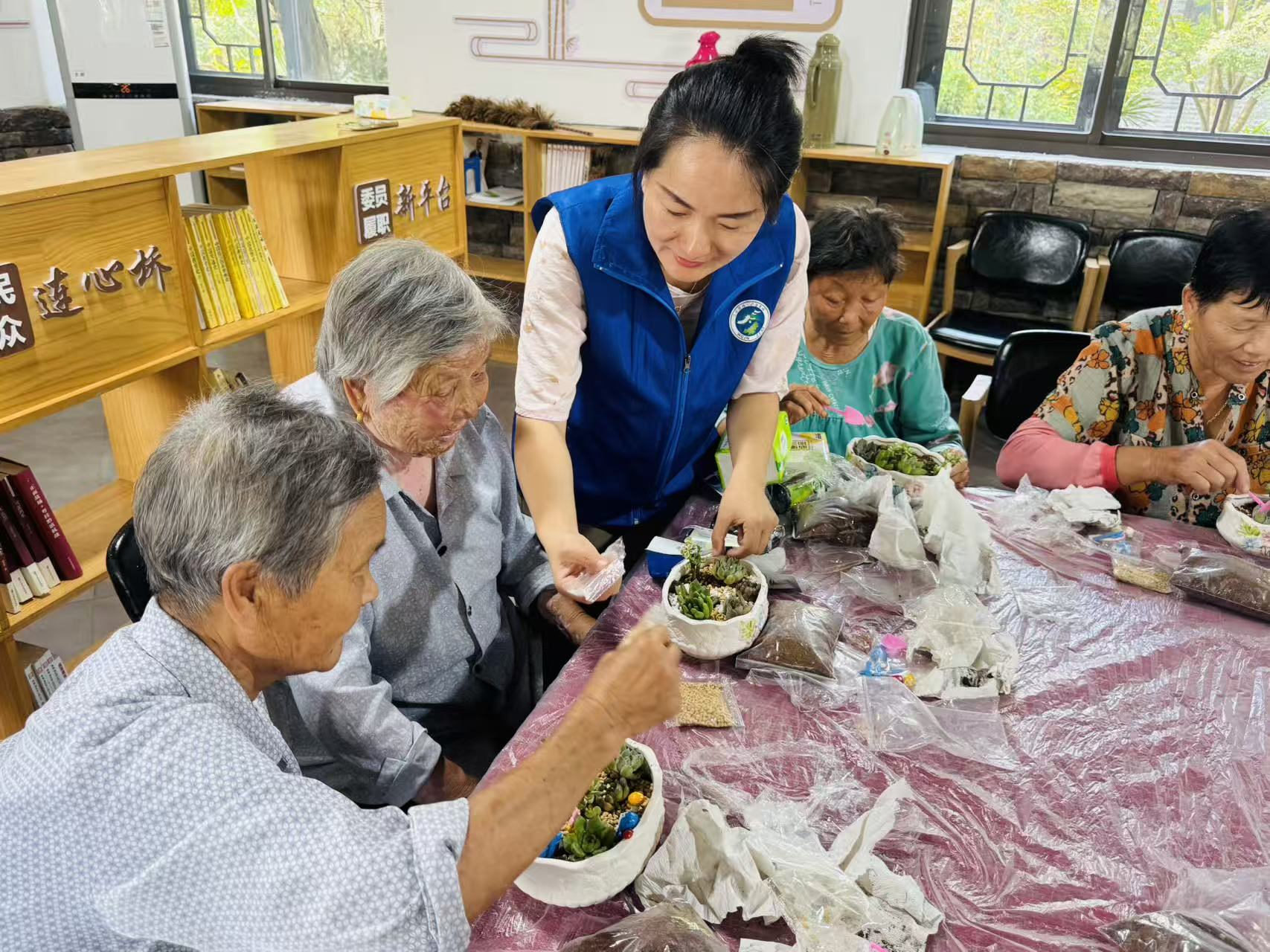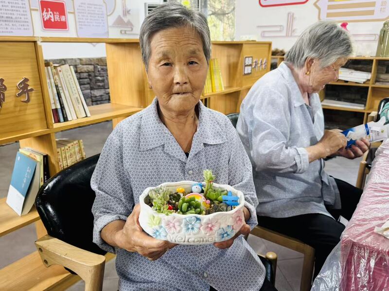 最受老人们欢迎的,当数“掌心植绿意”多肉种植体验。志愿者提前备好多肉幼苗、营养土和花盆,从“选盆技巧”“配土方法”到“铺面石铺设要点”,一步步细致示范。老人们小心翼翼地捧着多肉,专注填土、认真摆造型,不时与身边伙伴交流心得,眼神里满是对生活的热爱与期待。