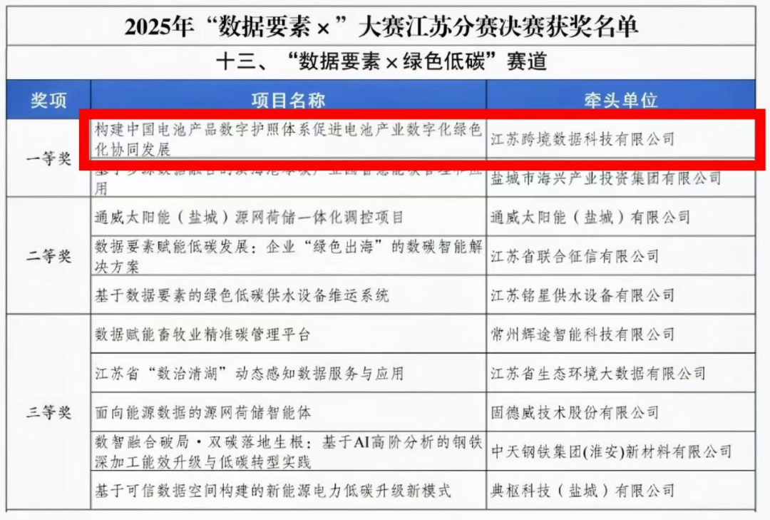 近日,2025年“数据要素×”大赛江苏分赛绿色低碳赛道比赛展开激烈角逐,江苏跨境数据科技有限公司(江苏国际数据港运营主体)的“构建中国电池产品数字护照体系促进电池产业数字化绿色化协同发展”项目在127支参赛队伍中脱颖而出,斩获一等奖荣誉,并顺利晋级全国总决赛。