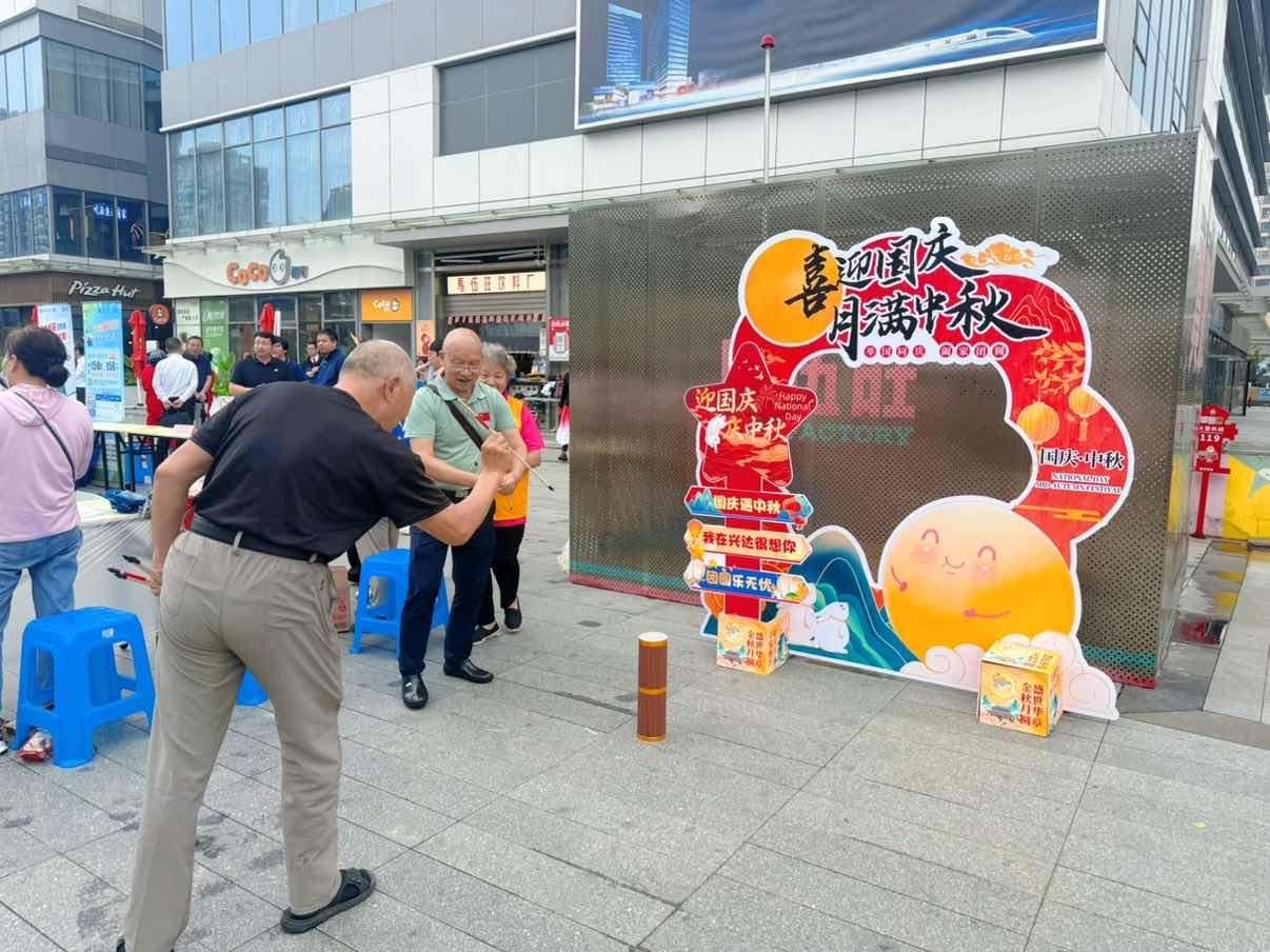 在传统文化体验区,各类特色活动吸引着不同年龄段的居民,让大家在互动中感受传统节日的独特韵味。月饼DIY品尝区香气四溢,大家亲手制作、品尝月饼,感受着中秋佳节的独特韵味;“久久公益”爱心义卖摊前人头攒动,党员志愿者们热情推介着实用日用品、手工饰品等义卖品。“既能买到需要的东西,又能献爱心,特别有意义!”居民李阿姨挑选着物品,脸上满是笑容;古风背景板前,阿姨们开心地拍照留念;投壶游戏区,大人小孩排队参与,瞄准、投掷,每一次成功都伴随着欢呼,浓厚的传统文化氛围感染着在场每个人。
