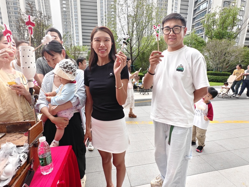 而是非遗体验区更是被年轻人和孩子们围得水泄不通。糖画师傅摊位前,居民们举着手机拍“糖浆变玉兔”的全过程,还不忘发朋友圈配文“中秋的仪式感被糖画拿捏了”;捏面人摊位前,小朋友拉着家长的手要“捏一个天安门”,老师傅笑着揉起红色面团,让国庆元素在指尖“活”了起来。另一边的美食区,万科物业人员化身“美味魔法师”为居民制作各种美食,月饼、桂花饮、各种网红小吃应有尽有,年轻人们端着餐盘穿梭其间,边吃边聊,活脱脱一场社区版“美食嘉年华”。