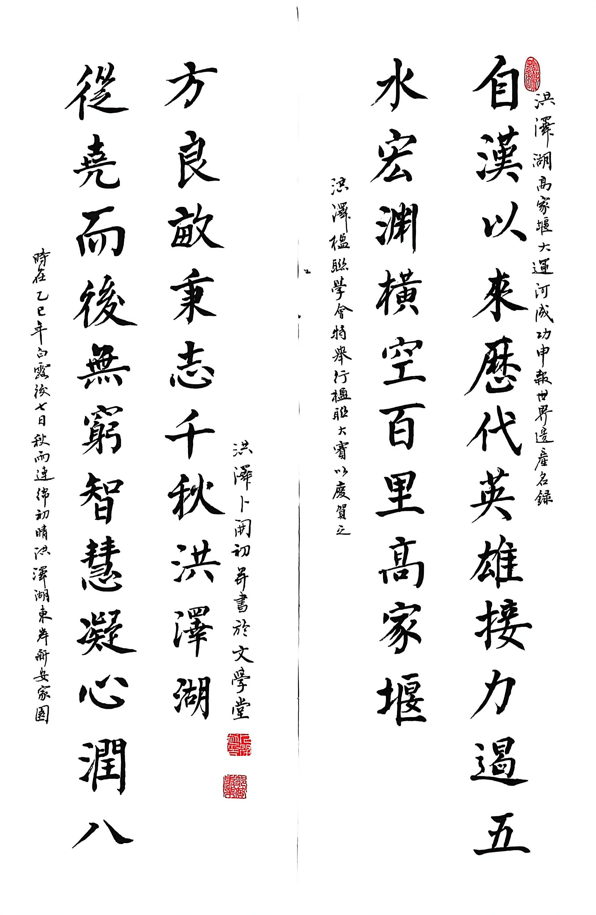 从尧而后,无穷智慧凝心,润八方良亩,秉志千秋洪泽湖。