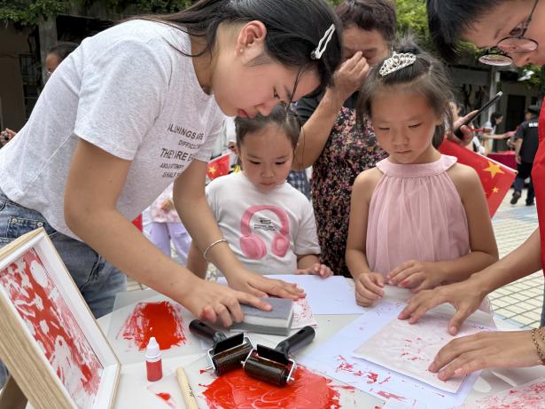 齐武路社区新时代文明实践站将非遗传承与红色教育融合,开展“薪火相传映初心 非遗箔彩绘山河”主题党日活动,党员们在金箔上贴绘党徽、天安门,在千年金箔技艺体验中强化身份认同;科宁社区新时代文明实践站的古法雕版拓印体验区,居民用梨木版拓印玉兔、月饼图案,墨香中感受传统技艺的魅力。这些活动打破“文化单向传播”模式,让居民从“旁观者”变为“参与者”,让双节文化在互动中焕发新生。