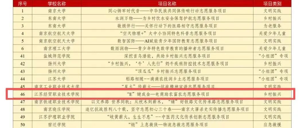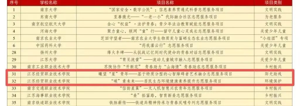 中国江苏网讯 近日,由共青团江苏省委、江苏省青年志愿者协会主办的2025年江苏省高校青年志愿服务项目大赛暨高校青年志愿服务研讨活动在南京举办,江苏经贸职业技术学院的数字商务学院“E”键成金——电商助农富农志愿服务项目获一等奖,数字商务学院曦望“星”青年——基于特质分型的心智障碍者艺术融合志愿服务项目、健康学院“碳”索未来——居民生态环境健康素养提升志愿服务项目获三等奖,获奖数量和等次均列全省高职院校第一。
