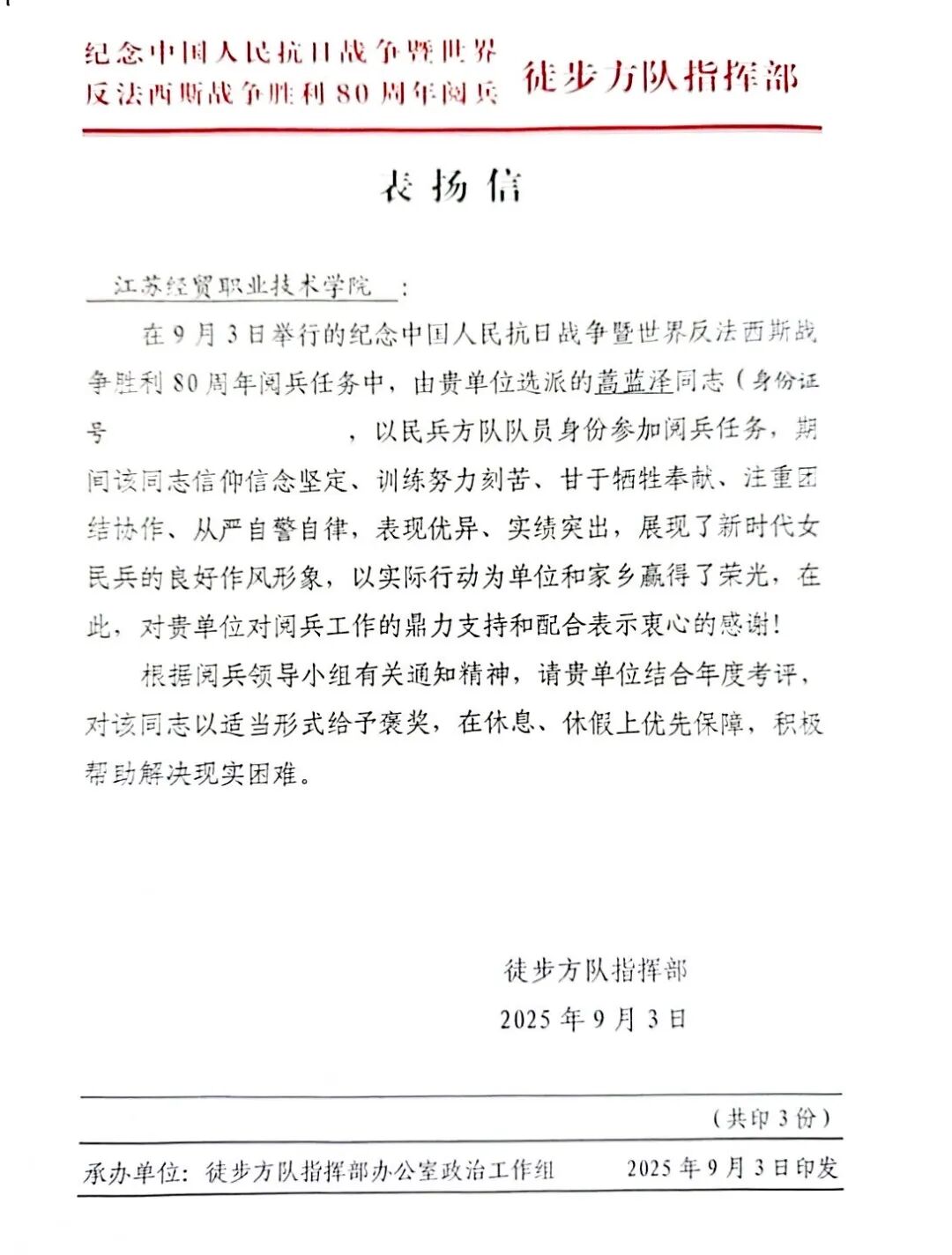 这份荣光的背后,还有学校“全员、全过程、全方位”育人体系的支撑。校领导专程慰问鼓劲,学院老师定期跟进她的身心状态,还为她定制了专属学业辅导计划。“我的阅兵梦,也是经贸育人梦结出的果实。”蒿蓝泽始终记得这份温暖。