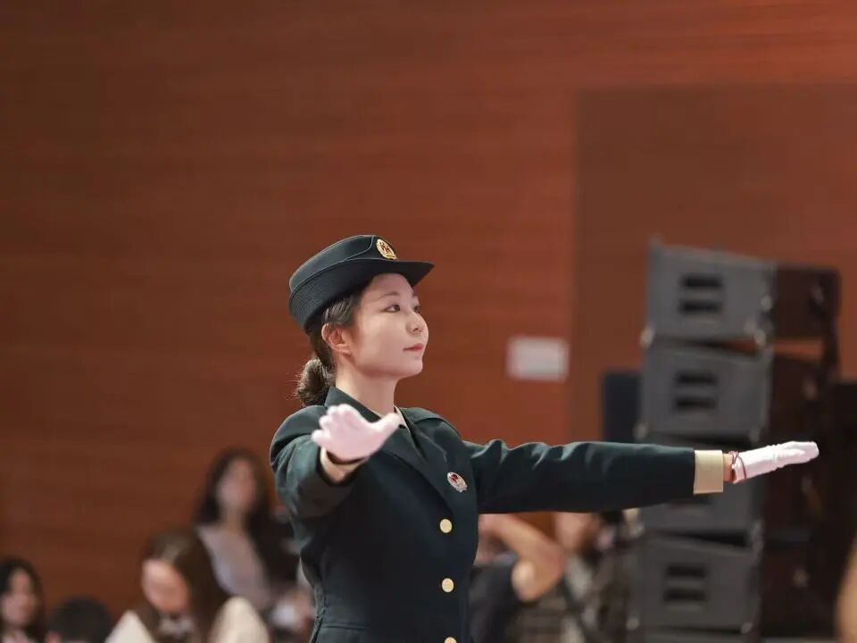 作为国防教育协会副会长和校国旗护卫队特邀顾问,她牵头参与组织招新,用自己的军营故事和阅兵经历,把国防教育从课本上的概念,变成了鲜活的体验;作为军训助训教官,她教新生站军姿、踢正步时,总会想起自己在阅兵场的训练时光,既保持着退伍军人的专业严谨,又带着学姐的亲和力,“我知道他们需要什么,所以更懂怎么帮他们学会坚持。” 2024、2025年新生军训时,她不仅带队员练队列,还在军训歌曲比赛中担当指挥,带领会计与审计学院学子拿下第一名;训练间隙,她会和新生聊起军营里的趣事、阅兵场的荣光,在轻松的氛围里完成最生动的国防教育。
