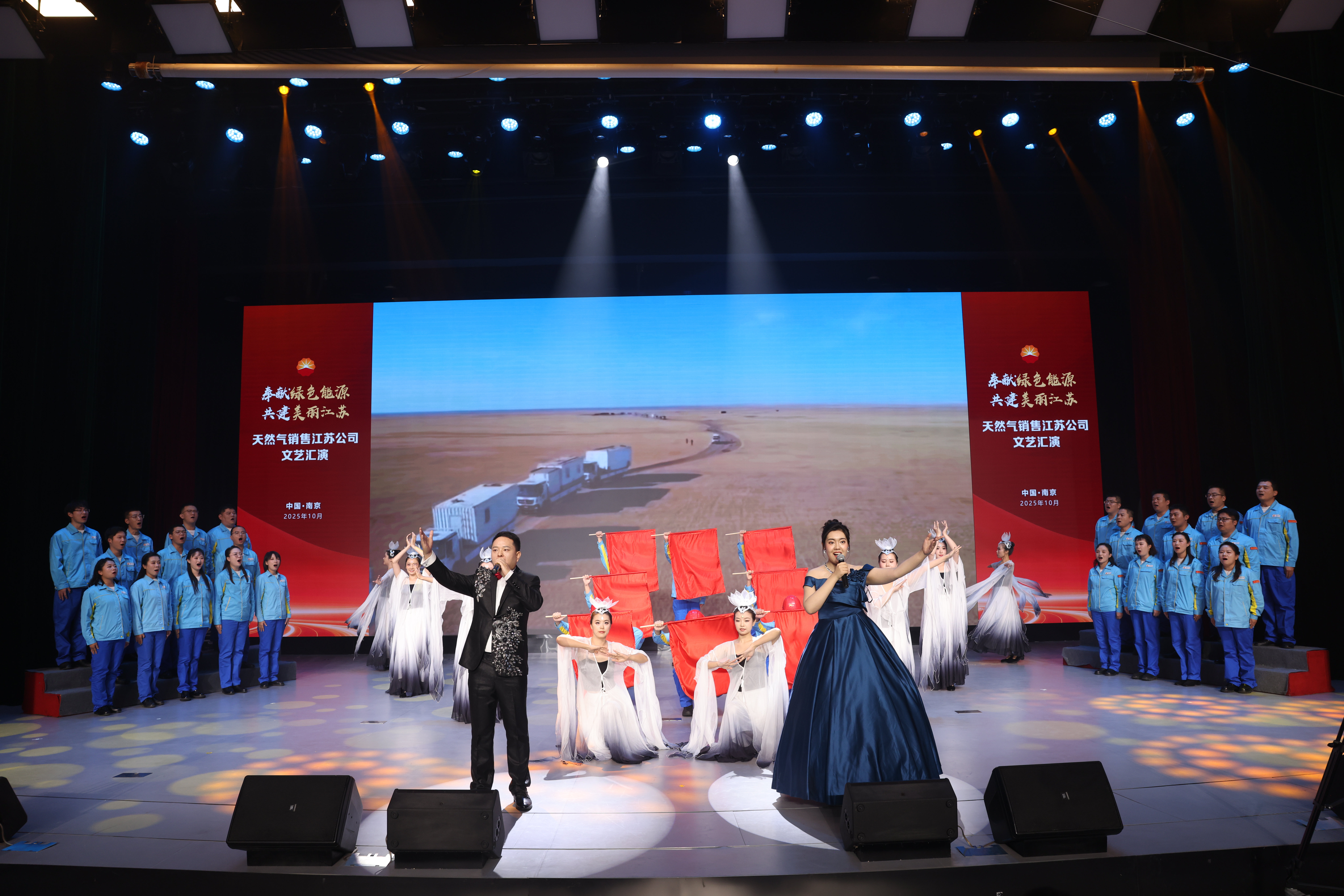 台上光影流转,台下掌声不断。八个原创节目通过多元艺术载体,以“能源叙事”为主线,以跨界艺术形式展现企业社会责任。情景朗诵《能源之光·锦绣江苏》以千年燃气史为脉络,通过音画诗诵展现从历史到现代的能源奋斗图鉴;评弹《燃气情·四季安》以吴侬软语细述燃气人寒来暑往守护万家灯火的温情故事;小品《愿您平安》《家庭约谈》则以生活化场景传递安全理念与廉洁家风,在轻松幽默中深化“平安是福”的民生担当;舞蹈《旗韵江南·气润万家》以旗韵江南的灵动舞姿描绘能源与人文、传统与现代的和谐共生画卷;原创歌曲《星光》《蓝焰战马》通过铿锵旋律与青春律动,唱响青年燃气人抢修现场奔跑的脚步与燃烧的奋斗热情;最终,合唱《把血加热再出发》以铁人精神的激昂旋律收束,将“能源报国”的誓言融入新时代江苏燃气人的血脉。八个节目,八种精彩,共同绘就了“奉献绿色能源 共建美丽江苏”的壮美画卷。